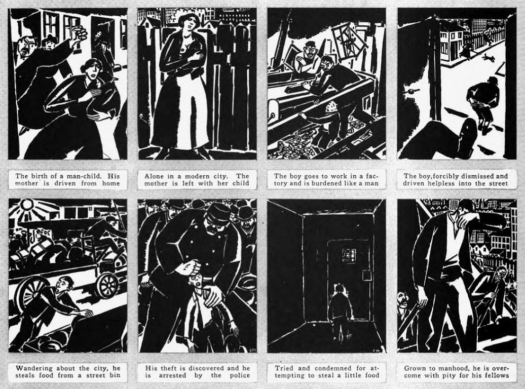 From 1918 on, Masereel released various innovative books with woodcut-printed narrative images, which can be considered precursors to present-day graphic novels. Named "visual suites", the books had one image per page, no dialogue and socially conscious themes. The first was '25 Images de la Passion d'un Homme' ('25 Images of a Man's Passion', 1918). The book consists of 25 images, without dialogue. The protagonist is a young man, born into misery. His mother is not his biological parent and rejects him. The man leads a life of debauchery, to compensate for his low-paid job. Eventually he wisens up and decides to not take it any longer. He educates himself and rallies his co-workers to rise up against his boss. But instead of a revolution, his plans are thwarted. The authorities arrest him and have him executed.
