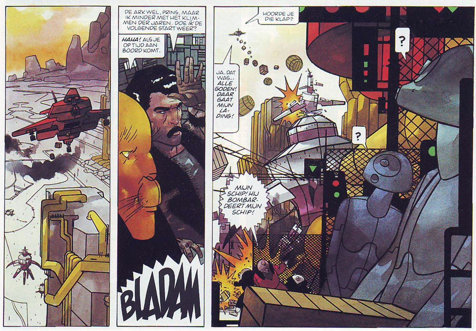 During the 1980s and 1990s, Matena was present in a great many magazines, while experimenting with several styles and genres. In addition to Eppo, Donald Duck and Tina, he contributed to the Dutch edition of Playboy magazine with four oil-painted stories starring the character 'Titia' (1985-1986). For Eppo's successors Sjors en Sjimmie Stripblad and SjoSji, Matena returned to the science fiction genre with the painted comic 'Alias Ego' (1993-1996), about the shady dealings of a space pirate and his lion-like partner-in-crime, Prins. For their adventures, Matena crafted a completely new world called The Ledge, which was a cross between a pirate lair and Charles Dickens' London. Two of the three stories were collected in book format by Big Balloon.