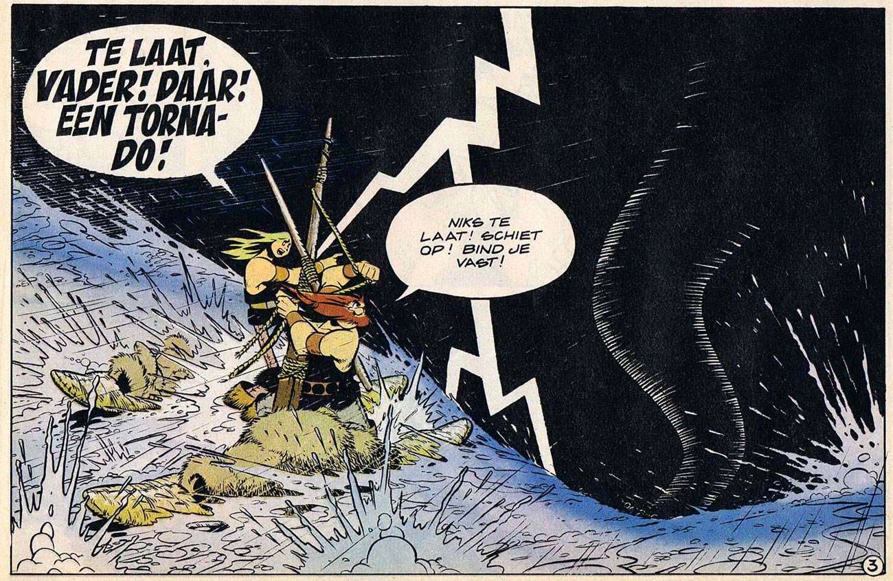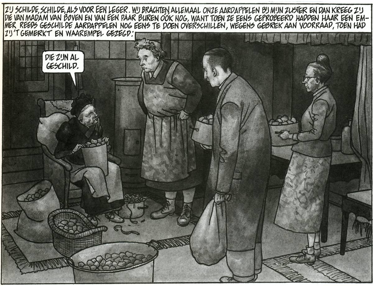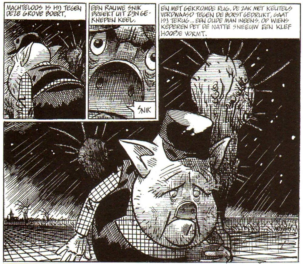 In the following years, Matena occasionally returned to the "heartbreaking work of the almost forgotten novelist A. den Dooier" in Eppo and other magazines through short stories like 'De Martelgang van Kleine Lien' (1980) and some Christmas-themed stories with anthropomorphic hens and roosters. In the mid-1980s, Matena created a full-length version of 'De Teloorgang van Oude Knudde' (1985-1986) for Eppo-Wordt Vervolgd magazine. This time, the A. den Dooier myth was fully played out, as the story was introduced by an "interview" with the "now retired writer". Set in the Dutch province of Noord-Brabant in the first half of the twentieth century, the Lamstra farming family lives a harsh life among the pollard willows in the rainy countryside. With limited resources, father Knudde and his wife try to provide a good life for their two sons, the simple Krelis and the riotous Dirk, although the involvement of the pub owner's daughter and the village priest result in a tragic mix of drinking, fighting, sex and death.