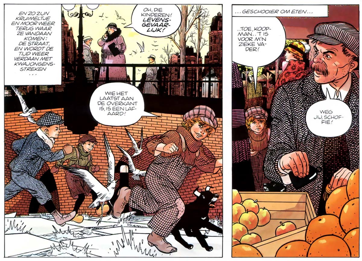 After his fake A. den Dooier adaptations, Matena embarked upon what would become his trademark: adapting literary works into comics. His first excursions in this field were done for Donald Duck weekly, the magazine for which he had been drawing Disney comics since the 1970s. For this magazine, he adapted several classic Dutch children's books, namely Chris van Abkoude's 'Kruimeltje' (1988) and 'Pietje Bell' (1991), C. Joh. Kievit's 'Uit het Leven van Dik Trom' (1990) and 'Dik Trom en zijn Dorpsgenoten' (1992), and Nienke van Hichtum's 'Afke's Tiental' (1994). He additionally made six stories based on Setske de Haan's novel series 'Joop ter Heul' for the girls' magazine Tina (1994-1995). These works were forerunners of the adaptations of Dutch literature that would increase Matena's notability outside of the regular comics circles in the 2000s.