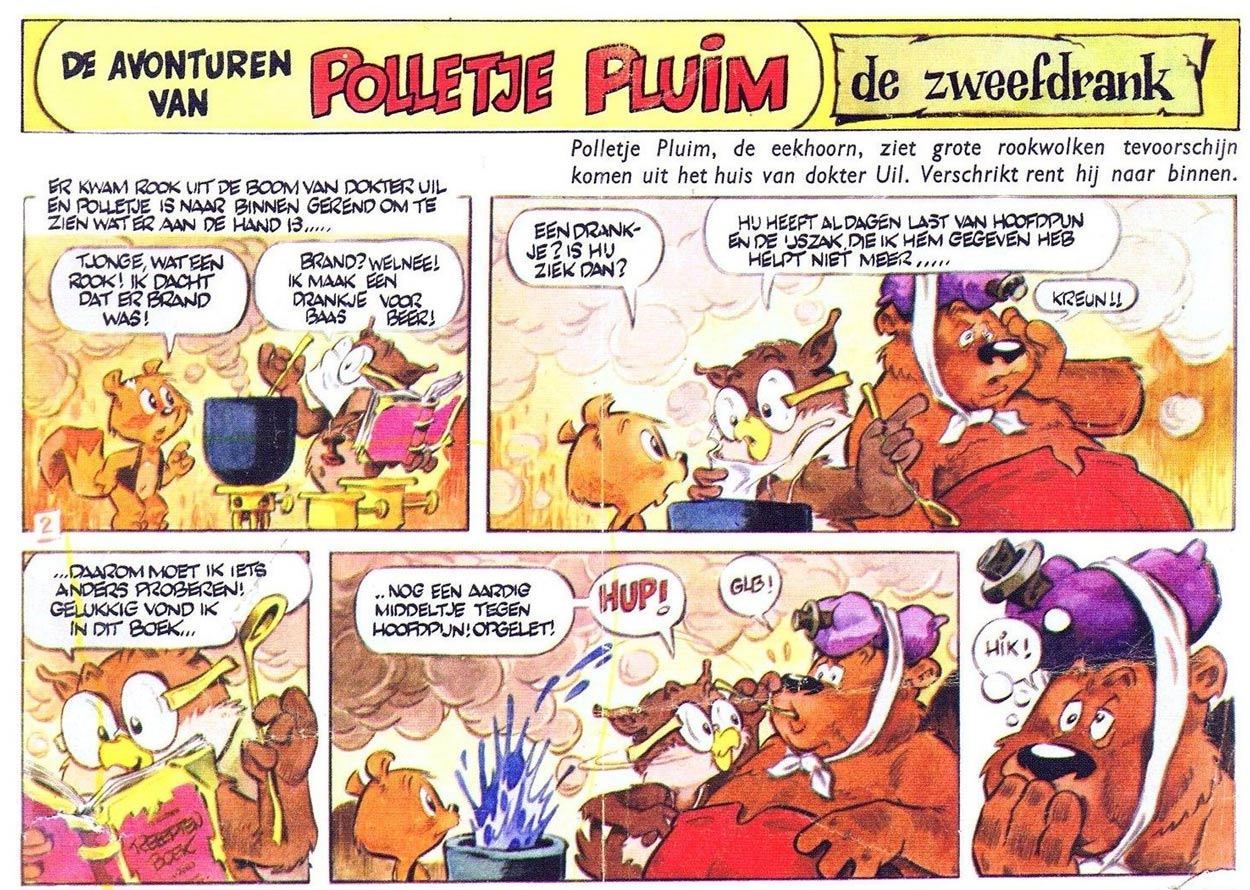 Besides Toonder's newspaper comics, Matena also contributed to other Toonder Studio productions. In 1966 and 1967, he drew his first stories with Walt Disney's 'Big Bad Wolf' for Donald Duck weekly, while receiving his first credit as co-creator of the funny animal comic 'Polletje Pluim' (1967-1968). Debuting on 7 January 1967 in the Christian women's weekly Prinses, the Walt Kelly-inspired feature stars a shy, anthropomorphic squirrel and his forest friends. While the first page had coloring by Wim Lensen, the later ones were ink-colored by Matena himself. After writing and drawing four full episodes and the start of the fifth adventure until March 1968, Matena left the Toonder Studio's. Until 1972, 'Polletje Pluim' was continued with artwork by Jan van Haasteren, with Patty Klein and Andries Brandt providing the scripts.