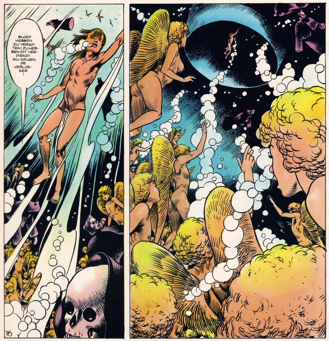 Another notable series of surrealist short stories is 'Mythen' ('Myths'), in which Matena portrayed famous people like Bob Dylan, Alfred Hitchcock, Hugh Hefner, John Lennon, James Dean, Marilyn Monroe and Elvis Presley in semi-fictitious stories. After a series of eight 10-page stories in the period 1980-1982, a final story about Walt Disney followed in 1986. Matena additionally created the largely improvised story 'Het Web' ('The Webb', 1983), and the full-color short story 'Beet!' (1983), the latter written by the Spanish scriptwriter Enrique Sanchez Abuli. Both were first published in France and Spain. In 1986 and 1987, Matena's fantasy diptych 'Het Sterrenschip' appeared in the Dutch magazine Titanic, and also in German translation. Although it was not part of the 'Myths' series, Matena additionally created a comic story about the last days of American writer and poet Edgar Allan Poe ('De Laatste Dagen van E.A. Poe', 1987), published in Dutch (Wordt Vervolgd magazine) and, in a colorized version, German.