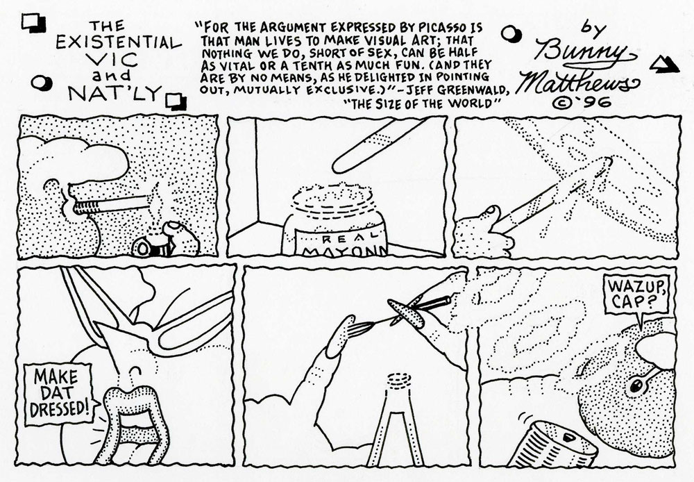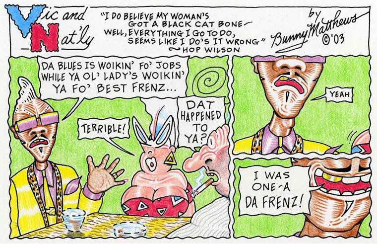Bunny Matthews was a U.S. cartoonist, writer and painter, enjoying fame in his home town of New Orleans with 'Vic and Nat'ly' (1982-2005), a long-running newspaper comic series with locally oriented comedy and dialogues.