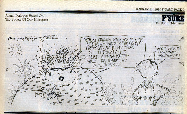 In 1968, Matthews started his cartooning career with the alternative newspaper The Word. From the late 1970s until the early 1980s, the weekly magazine Figaro ran his cartoon series 'F'Sure: Actual Dialogue Heard on the Streets of New Orleans'. All episodes were based on conversations he overheard in stores, bars and on the streets. For authenticity, he wrote them in the local New Orleans slang, known as "Yat". In 1978, a selection of episodes were compiled and published in book format. The series established Matthews as a sharp and insightful observer of New Orleans characters, quirks and foibles, and landed him his next cartooning job with the The Times-Picayune newspaper, the comic strip 'Vic and Nat'ly'.