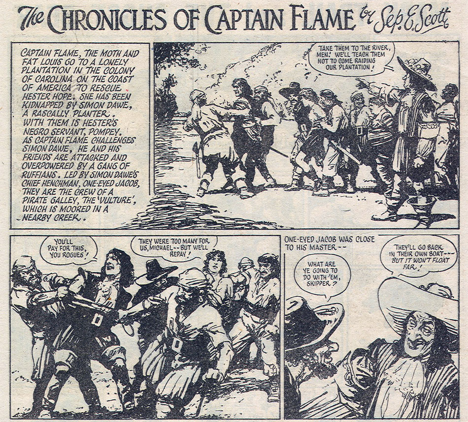 'Captain Flame', written by Leonard Matthews and drawn by Septimus E. Scott (Knockout, 6 October 1951).
