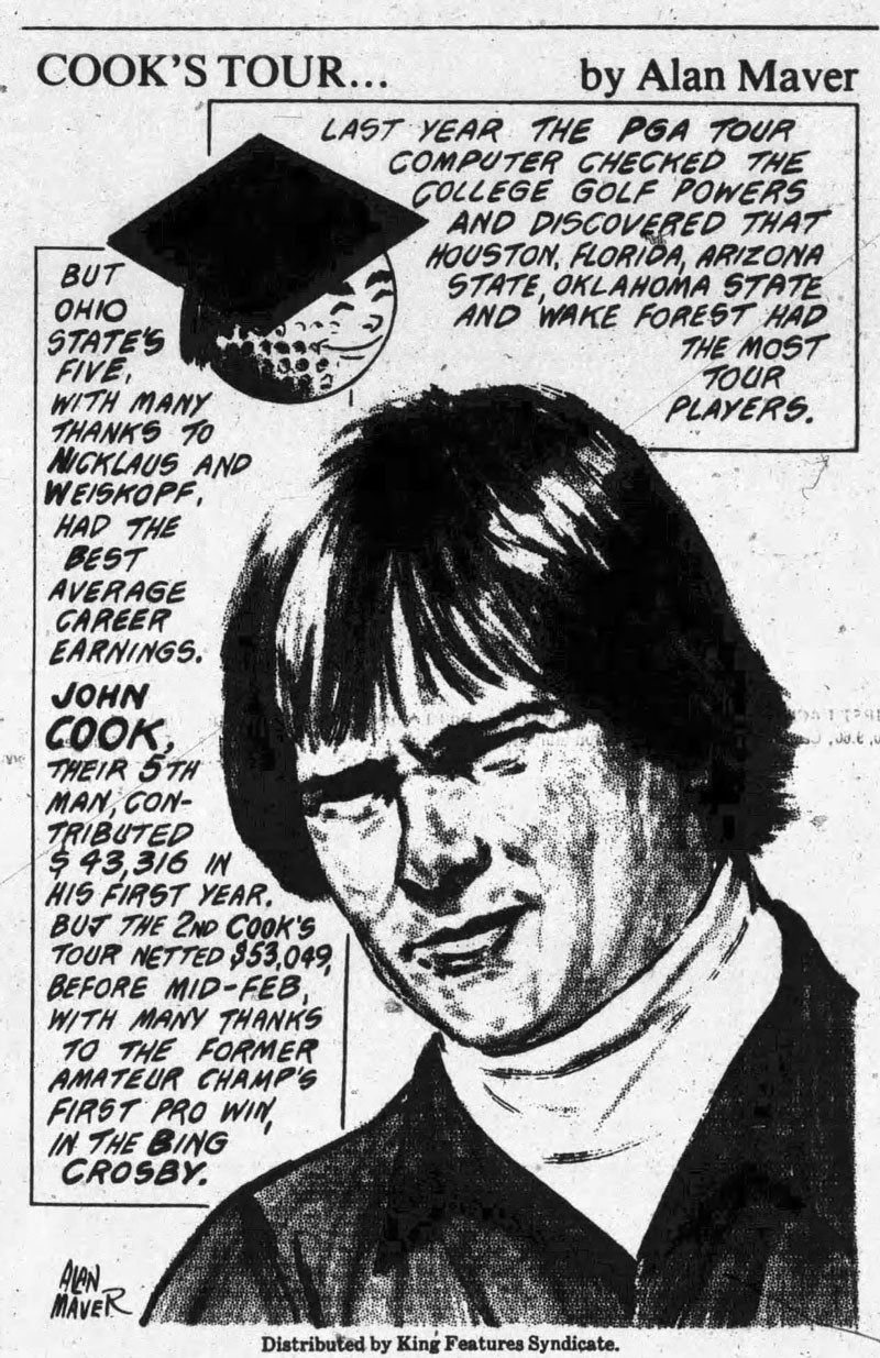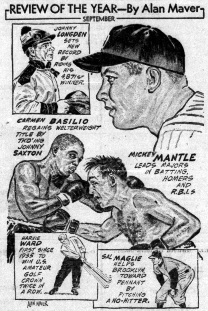 By the 1930s, Maver's sports cartoons were distributed by the United Features Syndicate, until in 1948 he moved over to King Features Syndicate. Active until the early 1980s, his feature appeared under many different titles, including 'Sport Spots', 'Review of the Year', 'For the Buck-Eyed' and 'Hall of Fans'. In his panels, Maver delved into specific accomplishments of the sports stars of the day, usually presented as a drawn portrait picture surrounded by spot cartoons and accompanying text.