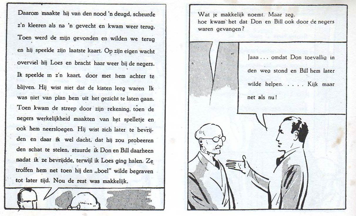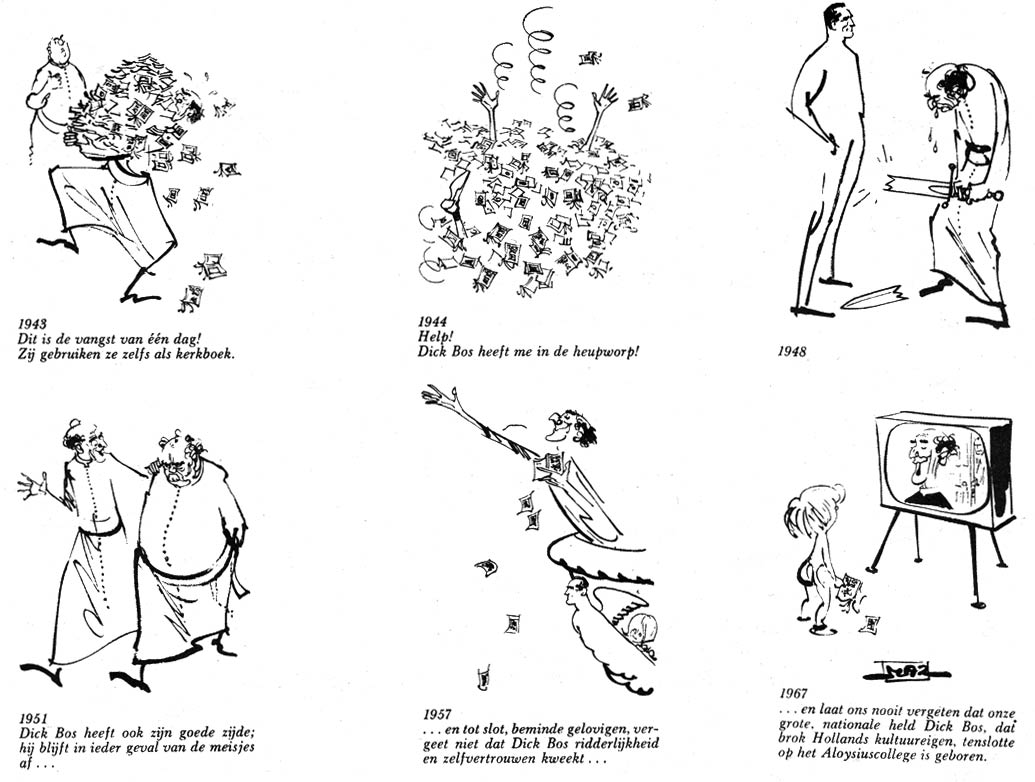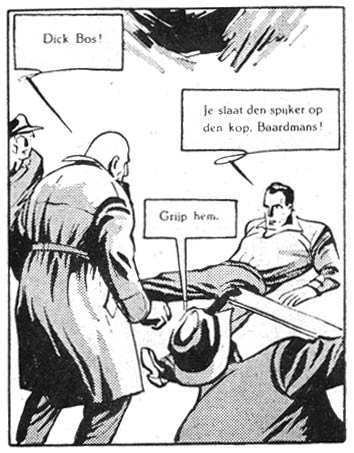 At the height of the "beeldroman" popularity, novelist and columnist Godfried Bomans wrote a parody strip, 'Dick Parker', satirizing the heavy violence by making the body count rise into the ridiculous. The illustrations were provided by Rein van Looy. The comic strip was later collected in Bomans' book 'Capriolen' (1953). None other than Marten Toonder also satirized 'Dick Bos' in his 'Tom Poes' story 'Horror, De Ademloze' (1949). The story features the silly goose Wammes Waggel obsessing over his favorite comic strip 'Dick Dubbelslag' to the point that he is inspired to commit real-life violence. It soon turned out that it's a "magical" comic strip, which duplicates all violent action in its pages in real life.