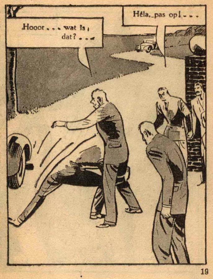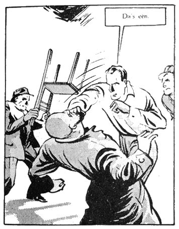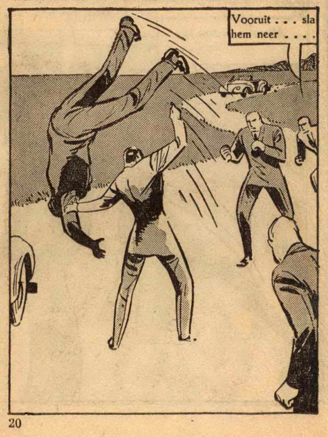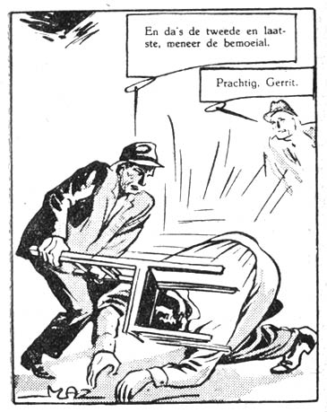 Between July 1940 and February 1941, De Prins serialized Mazure's first 'Dick Bos' story, titled 'Het Geval Kleyn'. He signed it with the first three letters of his last name, "MAZ". Dick Bos' last name was derived from the English word "boss". Indeed, the steep investigator shows every criminal who's boss. He is a no-nonsense private detective, whose fists are just as swift as his mind. Dick Bos is a master in jiujitsu, and graphically modeled after the real-life judo-wrestler Maurice van Nieuwenhuizen from The Hague. Mazure's comic hero battles (organized) crime around the globe. Near the end of each story, he traditionally reveals how he solved his mystery, usually through some heavy-handed and wordy captions. After this first serialized story, Mazure began a collaboration with the publishing house Ten Hagen, who, from 1941 on, started publishing monthly 'Dick Bos' comic books. The comics were published in a rather unusual format - the books are just 7 cm wide and 11 cm high (3" x 4"), so they could fit into one's pocket. Each page generally contained only one single panel.