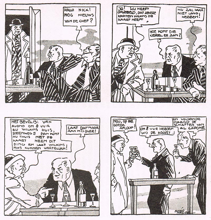 While working for the Neerlandia Press Group, Mazure had the opportunity to publish his earliest comic stories in the publisher's regional newspapers, including the Utrechtsche Courant, the Limburger Koerier and the Dagblad van Noordbrabant (en Zeeland). Between 21 December 1934 and 22 February 1935, these papers serialized his crime comic 'De Chef', about police chief Hans Vonk, who was a predecessor to Mazure's later character Dick Bos. Stylistically, 'De Chef' was influenced by Dashiel Hammett and Alex Raymond's newspaper crime comic 'Secret Agent X-9'. In March 1935, the story was also released in book format. Mazure followed up 'De Chef' with more one-shot crime comics: 'Da's Juist Iets Voor Willy' (1935), 'Jerry Gaat Speculeeren' (1937) and 'De Havik in Londen' (1937). The stories caught the attention of younger readers, since they were written and drawn in a realistic style that felt more adult than the usual fairy tales or gag comics in Dutch magazines. Mazure was also one of the earliest Dutch comic artists to use the speech balloon format, rather than the still dominant text comic style (with text underneath the images).
