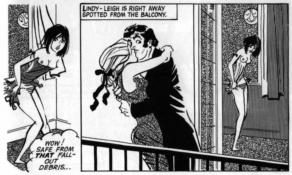 While Mazure's 'Jane, Daughter of Jane' wasn't a success, it caught the attention of the editors of the new British adult magazine Mayfair. They assigned him to draw a saucy comic strip for the magazine, inspired by the U.S. success of Harvey Kurtzman and Will Elder's 'Little Annie Fanny' in Hugh Hefner's Playboy. The result was the elegant but not-too-bright spy 'Lindy Leigh' (1969-1970), who, unlike her full color inspiration, appeared in black-and-white. Like Annie and Jane, Lindy was often pursued by hordes of horny men, while gradually losing her clothing. She debuted in Mayfair's very first issue.