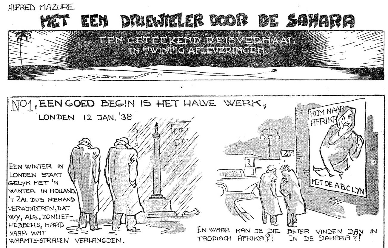In the mid-1930s, Mazure started traveling through Germany and the Balkan, and then to Turkey and North Africa. Interviewed by Louis Andriessen for Stripschrift #29 (1971), Mazure recalled that in Turkey his visa suddenly expired, so he had to falsify his passport. When the authorities arrested him and his friends, they managed to escape through their cell window and fled to the Bulgarian border. On the way, they ate themselves sick from the grapes they found on the roadside. His adventurous trip through Eastern Europe was chronicled in the illustrated travelogue 'Door Dik en Dun met Gipsy', which appeared in Haagsche Post in 1936. His adventures in the Sahara are recorded in the story 'Met Een Driewieler Door De Sahara' (1940), published in the motor cycle magazine Motor.