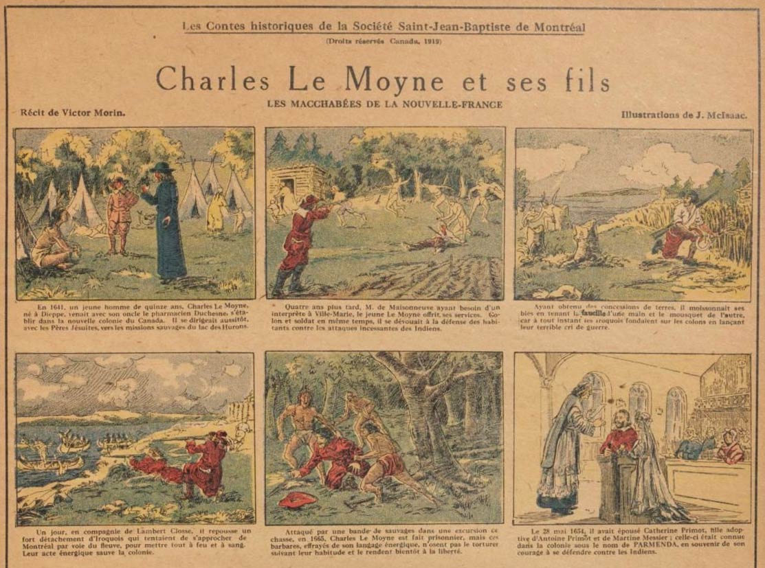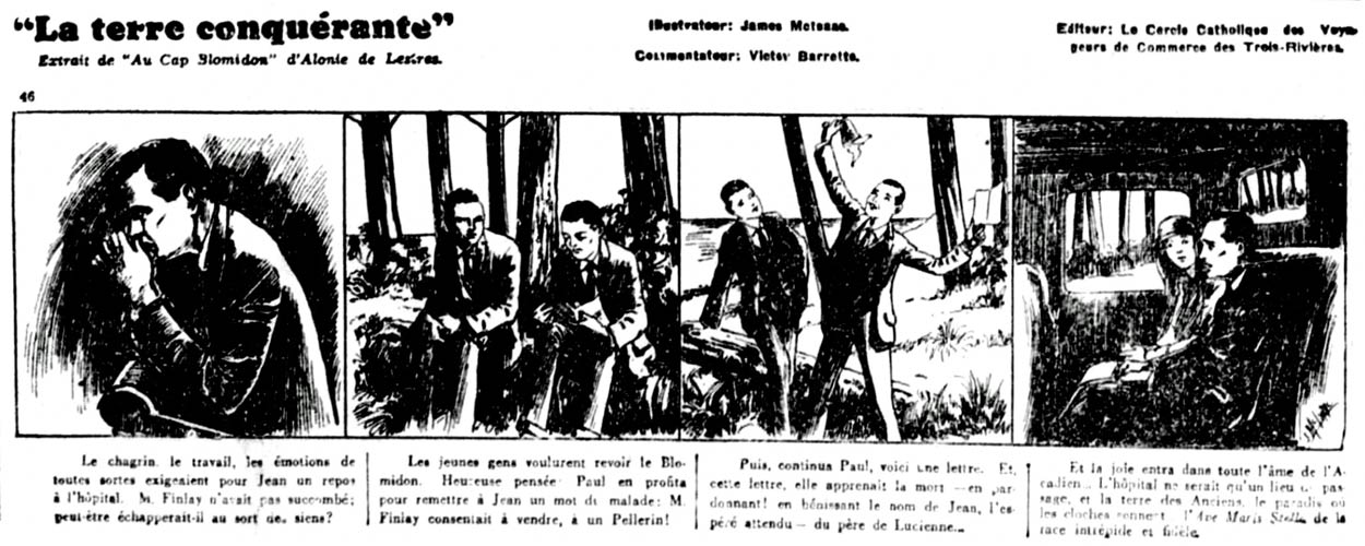 During the 1930s, James McIsaac additionally drew several comics serials for Catholic newspapers like L'Action Catholique, Le Devoir, Le Nouvelliste and the magazine Ma Gaspésie. These were distributed through the Catholic Association of Commercial Travelers, Trois-Rivières Section (L'Association Catholique des Voyageurs de Commerce Section des Trois-Rivières), and adaptations of devout Québec novels. Known strips by McIsaac were 'La Terre Conquérante' (10 August- 4 October 1935), an excerpt of 'Au Cap Blomidon' by Alonié de Lestres (Lionel Groulx), Antoine Gérin-Lajoie's 'Jean Rivard' (5 October - 11 November 1935), 'L'Homme aux Yeux Fermés' and 'Nos Jeunes' (June 1936). At least the 'Jean Rivard' and 'Au Cap Blomidon' adaptations were between 1936 and 1937 published in book format by the Association. Another productive artist for these types of Catholic comic strips was Jean-Jacques Cuvelier.