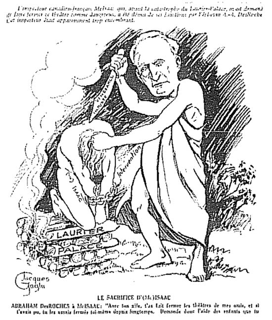 In 1929 and 1930, McIsaac responded to the tragic event of 1927 in his caricatures and cartoons for the magazine Le Goglu, to which he contributed under the signatures Jacques Goglu or JMI Goglu. McIsaac felt he was used as the fall guy during a period of public grief and hysteria. On 18 October 1929, the journal stated that McIsaac did in fact request the Laurier Palace to be closed down because of safety reasons. He hinted that Mr. Desroches had only fired the inspector because he was apparently too cumbersome. The text was accompanied by the biblically themed caricature 'Le Sacrifice d'(Mc)Isaac' ("The Sacrifice of McIsaac"). Four years after the fire, James McIsaac was reinstated in his function, and he kept this post until his retirement on 1 May 1959.