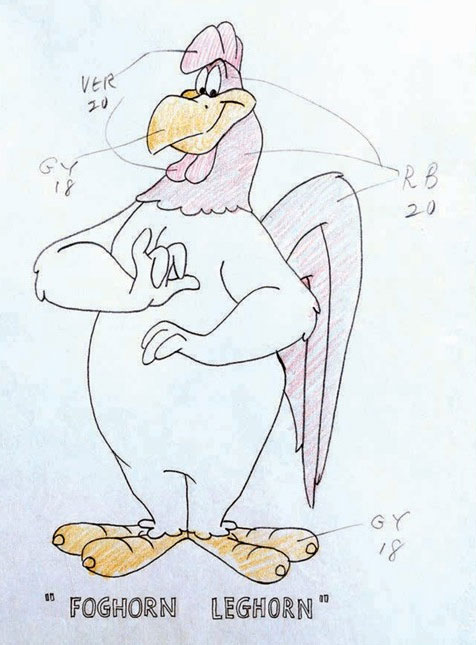 In 'Walky Talky Hawky' (1946), McKimson took a feisty little chicken hawk, Henery Hawk, originally created by Chuck Jones, and paired him with two brand new characters, Foghorn Leghorn and Barnyard Dog. Foghorn is a huge arrogant and talkative rooster. He often tries to lecture others, despite being quite dumb. Foghorn has an ongoing rivalry with a grumpy guard dog, Barnyard. They constantly try to trick each other, though often get the lid on their own noses. Foghorn's personality was based on the character Senator Claghorn from the radio show 'The Fred Allen Show' (1932-1949), played by Kenny Delmar. Delmar himself based Claghorn on an even older sheriff character from another radio sitcom, 'Blue Monday Jamboree' (1927-1935). Both spoke with a Texan accent, repeated sentences twice ("I say, I say son") and used proverbs and verbal comparisons. Various Looney Tunes characters were modeled after popular film and radio characters at the time, often down to their catchphrases. Voice actor Mel Blanc therefore saw no problem copying Claghorn's voice. The 'Foghorn Leghorn' cartoons developed into a series and would become McKimson's signature work.