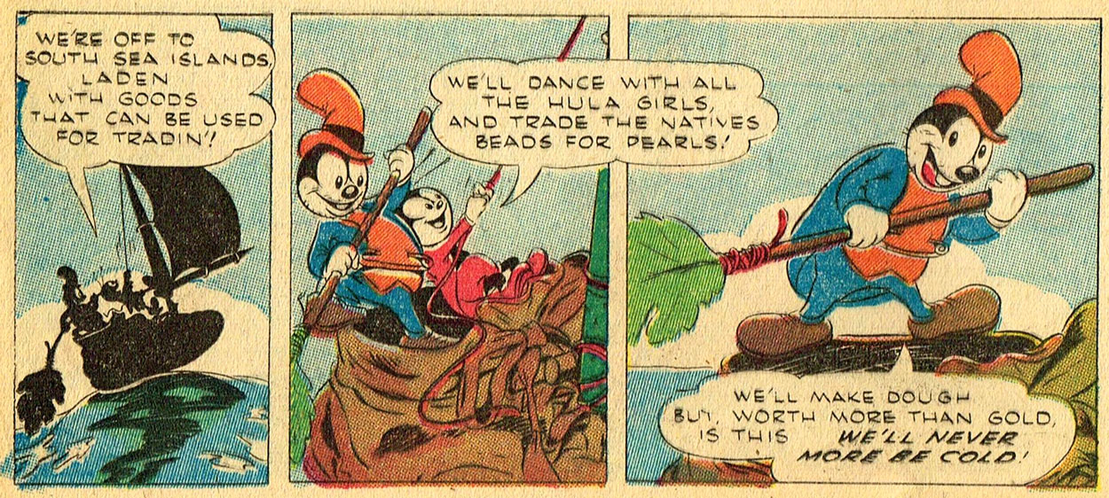 In 1929, Tom McKimson became an assistant-animator at the Walt Disney Studios, thanks to an aunt who met Walt at a party and recommended Tom and Bob to him. Tom was assistant-animator to Norm Ferguson, while Bob joined up two weeks later and became assistant to Dick Lundy. The brothers only stayed there for a year, as their father went out of a job, which forced them to support their entire family. Tom and Bob saw more financial benefit at the Romer Grey Studio, which was founded by the son of famous novelist Zane Grey (whose novel series 'King of the Royal Mounted' was adapted into a comic strip by Stephen Slesinger with Allen Dean and later Charles Flanders and Jim Gary). While the salary was good, Romer lost interest in his studio and spent most of the income on personal pleasures. Soon the company closed down without ever releasing anything.