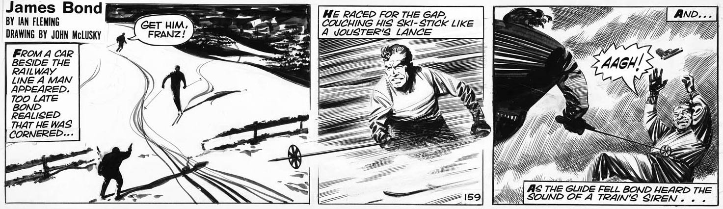 John McLusky was the original artist of the 'James Bond' newspaper strip, which appeared in the London Daily Express from July 1958 on. McLusky was an artist for Bomber Command during World War II, and then worked as a freelance illustrator for clients like DC Thomson.