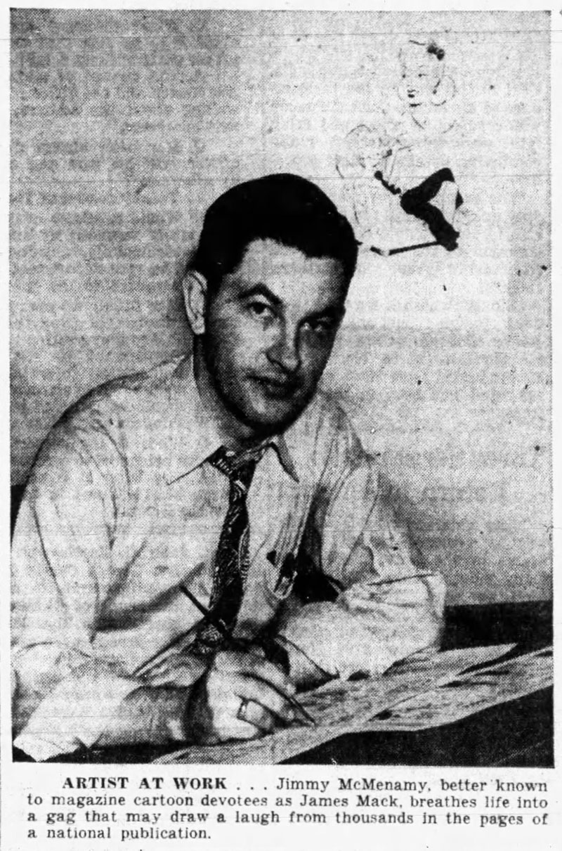 After his short stint on 'Dotty Dripple', McMenamy became Art Huhta's assistant on the screwball comic strip 'Dinky Dinkerton, Secret Agent 6 7/8'. It gave him valuable training in making gag cartoons, after which McMenamy became a commercial artist, as well as an illustrator/gag cartoonist for magazines like Colliers, The Saturday Evening Post, American, This Week, Cosmopolitan, Liberty, Argosy and Esquire. At first he signed with his full name, but he later switched to James or Jimmy Mack to avoid misspelling.