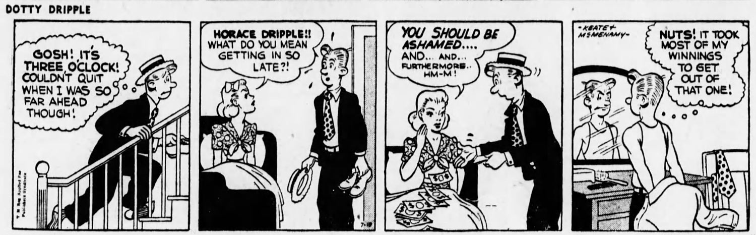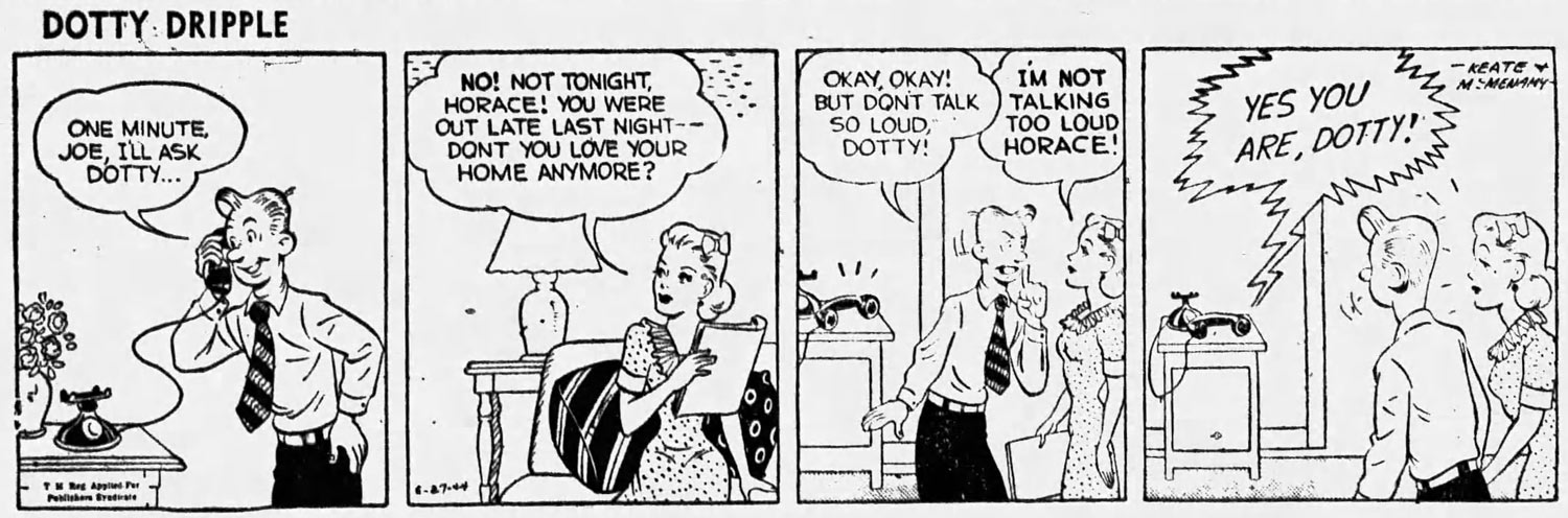 McMenamy left Consolidated Magazines to create a new newspaper comic strip with Jeff Keate. On 26 June 1944 their family comic strip named 'Dotty Dripple' (1944-1974) was launched by Publishers Syndicate. It was an obvious rip-off of Chic Young's 'Blondie'. All family members were virtually the same. Dotty Dripple was just Blondie again and her husband Horace was the identical twin of Dagwood. Both couples had children about the same age. Blondie and Dagwood's son was named Alexander and their daughter Cookie, while the Dripples had children named Wilbert and Taffy. The families even had similar dogs. Both Daisy in 'Blondie' and Pepper in 'Dotty Dripple' were mongrels who had similar expressive reactions. After four months McMenamy quit the series. From 16 October 1944 on, Buford Tune continued 'Dotty Dripple' until he retired on 9 June 1974. Under his run 'Dotty Dripple' also appeared in comic book series issued by Magazine Enterprises and later Dell Comics. Considering how obvious the plagiarism of 'Blondie' was, it's amazing that the creators were never sued.