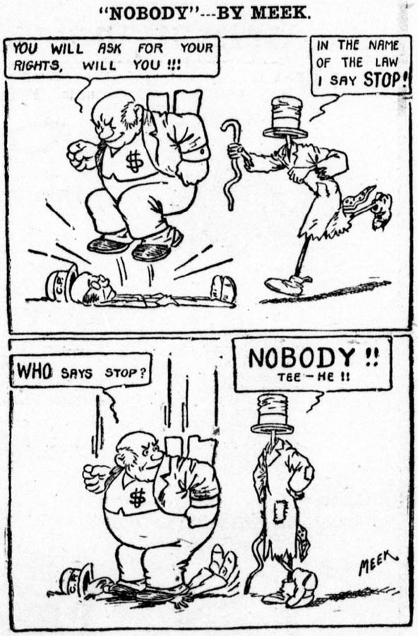 In January 1912, Meek drew a short-lived gag-a-day comic titled 'Nobody'. It stars a thin character in ragged clothes, whose high hat covers his entire face. The character's name is 'Nobody', which was also the formulaic punchline of every episode. Day after day somebody would ask a question starting off with the question word "Who...?", only to receive the reply: "Nobody", while Nobody laughed at the others' confusion. The running gag naturally got old very fast, and the feature ended in October of the same year.