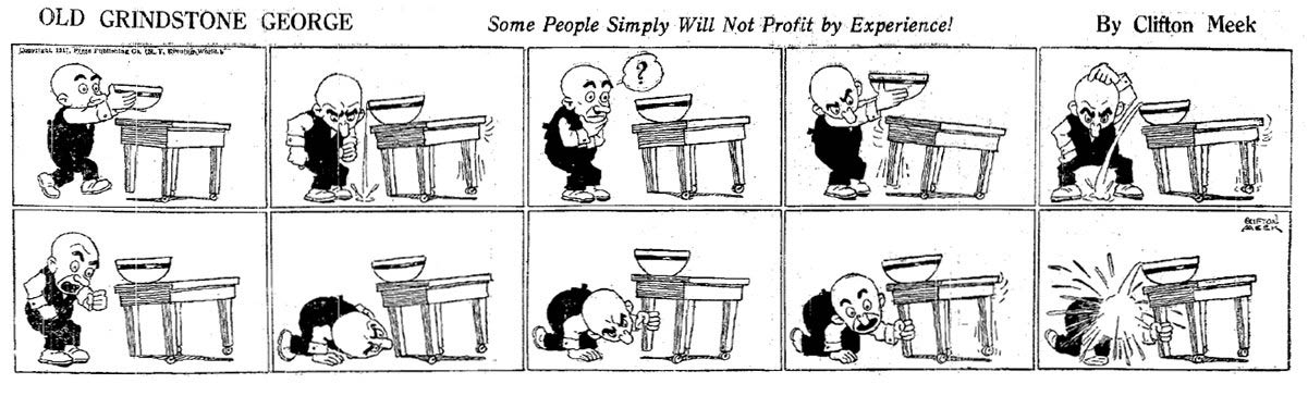 By 1915-1916, Meek was drawing comics for the New York World, owned by Joseph Pulitzer, and the New York Evening Journal. Between November 1916 and December 1919, he drew the series '(Old) Grindstone George' (1916-1919). Grindstone George is a bald, middle-aged man who is often unlucky. His mishaps were printed three times a week. Sometimes they had different titles, including: 'The Off Day', 'The Old Family Skeleton' and 'Old Grindstone George'. Meek used some of his old 'Nobody' gags as a topper comic for 'Grindstone George'.