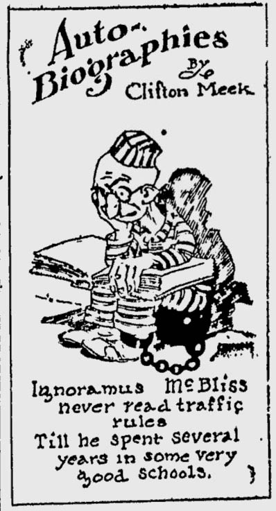 A break in the run of 'Grindstone George' happened when Meek created a different comic, titled 'Bachelor Bill', which ran from September through November 1917. Around 1923 he also had a one-panel cartoon called 'Auto-Biographies', which were presumably self-syndicated to small papers like Schenectady Gazette. It featured characters in slapstick incidents, accompanied by a sentence in rhyme which summarized how the incident came about. In 1922, he became one of the earliest members of the Silvermine Guild of Artists.