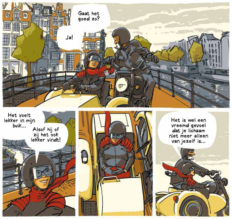 Meeuwsen's second graphic followed in 2020. With the semi-autobiographical 'Jaar Nul' (Sherpa, 2020), he gave an intimate, loving and humorous look at the life of a man in his fifties, who becomes a father for the first time: from the doubts in advance - Meeuwsen never wanted children before - and the difficult pregnancy with problematic delivery, to the pure practical issues of preparing the nursery, changing diapers and the well-intended advice of friends. Still, the book never became heavy-handed, and showed the bearded biker from his softest side. The book was also published in German ('Jahr Null') and French ('L'Année Zéro').