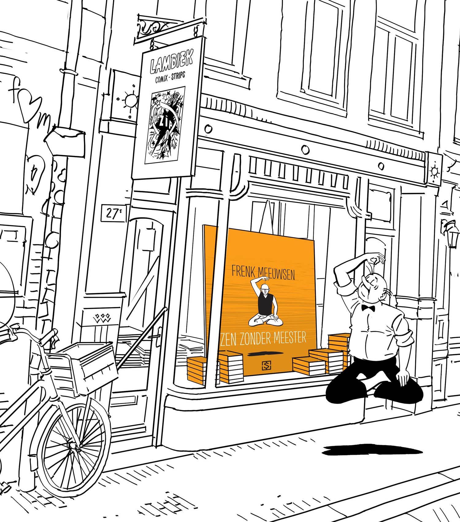 In the 2010s, Frenk Meeuwsen returned to the comics medium, when he started to chronicle his search for spirituality, truth, himself and the essence of Japan in short comic stories. Most stories take place in Japan, but the author also regularly revisited his youth in the Netherlands, with his father as his first guru. For these stories, he applied a black-and-white drawing style, strongly inspired by French artist David B. To Meeuwsen, "a drawing is like a Zen garden: wavy lines on snow-white paper." The 55 semi-autobiographical chapters were collected in the graphic novel 'Zen Zonder Meester' ("Zen Without a Master"), published by Sherpa in November 2017, and simultaneously released in Germany by Avant Verlag as 'Zen ohne Meister'.