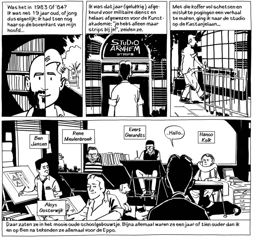 Born in 1965, Frenk Meeuwsen was nineteen years old when he joined Evert Geradts, Ben Jansen, Hanco Kolk, René Meulenbroek and Aloys Oosterwijk in their Studio Arnhem as an apprentice. During this period, he illustrated one short comic story, 'De Pavlov Reflex', written by René Meulenbroek, which was published in 1986 in the amateur comic magazine Coyote. It was reprinted in the 2017 memorial book 'Terug Naar Studio Arnhem'. In August 2016, Meeuwsen chronicled his time at the studio in a short comic story for the Studio Arnhem issue of comics news magazine Stripnieuws.