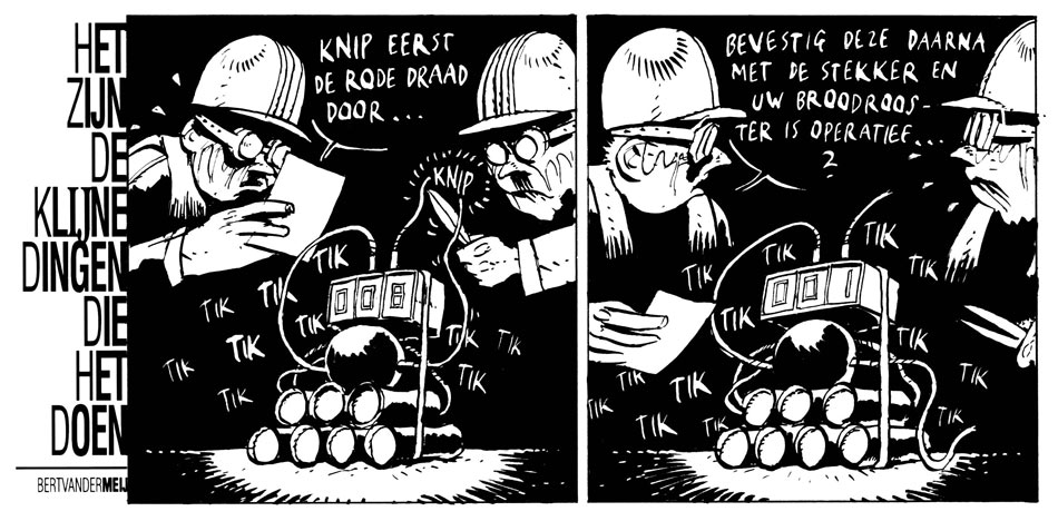 Bert van der Meij is a Dutch comic artist and editorial cartoonist, born in Katwijk aan Zee. He studied arts at the Royal Acadamy of the Arts in The Hague, and at the Californian College of Arts and Crafts in Oakland. While in the States, he exhibited his work on a couple of occasions. His first published comic strips and cartoons appeared in the free Dutch comics info-magazine ZozoLala, Emigre, Zone 3, Vinyl, Music Maker and Wordt Vervolgd from 1983 on. His first books, 'This Land Is My Land' and 'His Masters Voice', were published through Zet.El, the publisher of ZozoLala, in 1986-87.