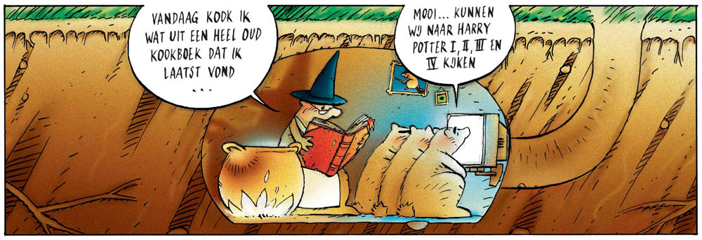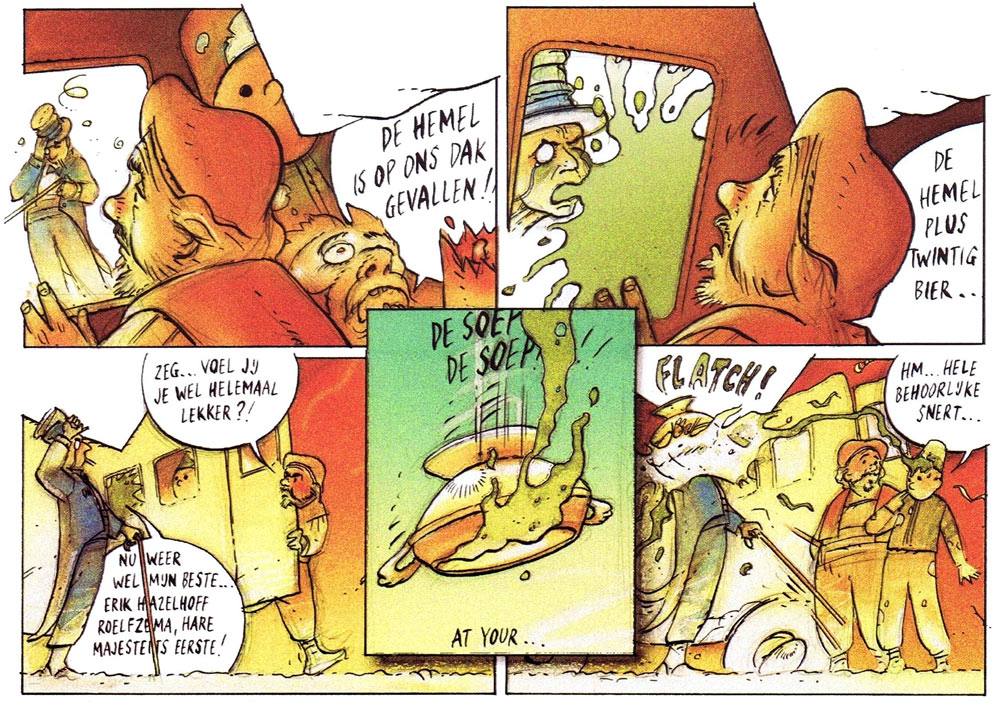 Van der Meij then began his long association with the publisher Sherpa, who released his books 'Jungleverhalen' (1989), 'De Mens Boeroebi' (1990), and the series 'Hooglied' (three books, 1989-94), 'Moesashi' series (three books, 1991-93) and 'De Winnaar' (two books, 2005). Sherpa also published the cartoon collections of Van der Meij's popular penguin cartoons, aptly called 'De Pinguïns'. Together with Lian Ong he made the books 'De Lift' and 'Liften' for the publishing house Casterman.