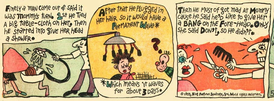 On 11 January 1959, Mendelsohn began his partially autobiographical comic 'Jacky's Diary' (1959-1961). The comic strip is presented as a diary written by a seven-year old young boy, though in illustrated sequences rather than a text. It describes big events from his viewpoint, such as a trip to the circus, a baseball game, a scouts meeting or having to endure a wedding. Everything is deliberately written and drawn as if a seven-year old kid made it. Crudely drawn doodles, spelling errors, grammar mistakes, naïve observations about the world around him,... It's a charming and spot-on pastiche. In some ways, the comic is very similar to René Goscinny and Sempé's 'Le Petit Nicolas' ('Little Nicolas'), which debuted the same year in France as a series of illustrated novels, although it had appeared earlier in 1955 as an actual comic strip. The main difference is that Sempé's illustrations are not intended to be drawn by the title character and therefore look far more professional. It's also highly doubtful that Mendelsohn was aware of this work when he created 'Jacky's Diary'. Two even earlier precedessors were the short-lived U.S. newspaper comic 'Buddy Spilliken's Diary' (1908) by Benjamin Cory Kilvert and, in the Netherlands, the long-running newspaper feature 'Uit het Kladschrift van Jantje' (1916-1936) by Felix Hess. Though 'Buddy Spilliken's Diary' combined deliberately clumsily written and misspelled narration with professional drawings. And while 'Uit het Kladschrift van Jantje' also mixed child-like writing and artwork, the feature was sometimes a one-panel cartoon and other times a comic. Again it seems very unlikely that Mendelsohn was aware of these very obscure predecessors.