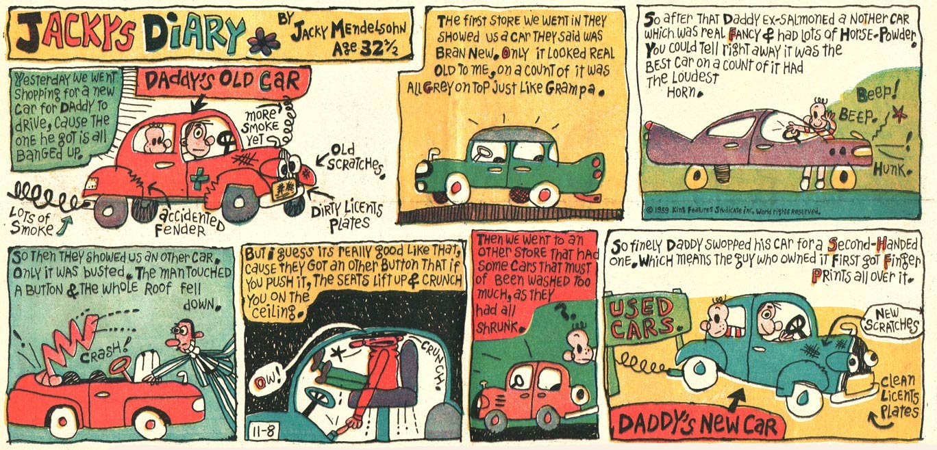 Jack Mendelsohn passed away in 2017 at age 90, from lung cancer. The idea of drawing comics in a crude, deliberately naïve, almost childlike style can also be found in the work of artists like Cal Schenkel, Gary Panter, Mark Marek, Haggi and Matt Furie.