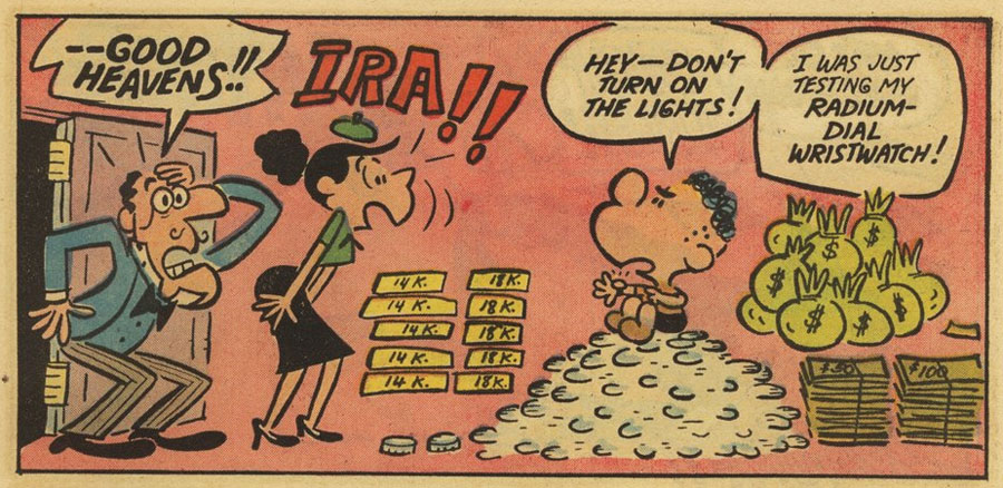 Mendelsohn moved to Mexico in 1951 and spent most of the decade there. Here he also befriended local cartoonist Sergio Aragonés before he became acquainted with Mad Magazine. Mendelsohn incidentally worked for one of Mad's first rip-off magazines, Panic, incidentally published by Mad's parent company E.C. Comics. Panic (1954-1956) ran for 12 issues and was edited by William M. Gaines and Al Feldstein. Mendelsohn was one of the main writers, alongside Nick Meglin, and his contributions from the 7th up to the 11th issue. They featured parodies drawn by Will Elder, Jack Davis, Joe Orlando and Wallace Wood. Some spoofed TV series ('Zoo Charade', issue #9, June/July 1955, with Joe Orlando), movies ('Gone With The Widow', issue #8, April/May 1955) and novels ('20.000 Leaks Under the Sea', issue #11, October/November 1955), both illustrated by Wood. Whenever comic series were lampooned, Mendelsohn collaborated with Will Elder. Together they tackled V.T. Hamlin's 'Alley Oop' ('Irving Oops', issue #8, April/ May 1955, with Will Elder), Nicholas P. Dallis' and Marvin Bradley's 'Rex Morgan, M.D.' ('Rx Migrane M.D.', issue #9 , June/ July 1955, with Will Elder), Roy Crane's 'Captain Easy and Wash Tubbs' ('Captain Izzy and Washt Upps', issue #10, August/ September 1955) and Allen Saunders and Dale Conner's 'Mary Worth' ('Mary Worthless', issue #11, October-November 1955, with Will Elder).
