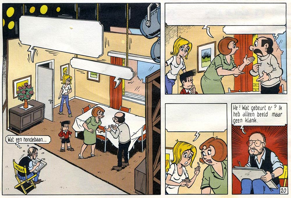 Merho's earliest assistant was Erik Meynen, who drew the backgrounds in 'Kiekeboe in Carré' (1978). Among Merho's co-workers are Peter Koeken, Rik Dewulf, Dirk Stallaert, Jeroen Weckers and his wife, Ria Smits. Smits, a full-time teacher, started as inker and letterer. When 'De Kiekeboes' became a success, she did the bookkeeping as well. Originally, the coloring was done by Resi Van Treeck, sister of Manu Van Treeck, head of the comics department of Standaard Uitgeverij. After Smits quit teaching, she became Merho's colorist, later joined by the couple's daughter, Ine Merhottein. Koeken, a Studio Vandersteen protégé, inked the stories between 1986 and 1991. Dewulf became co-artist in 1989 and stayed for a decade until he left to make the series 'Sam & Pilou' with Marc Daniëls. In the mid-1990s Patrick Van Oppen also assisted on the series.