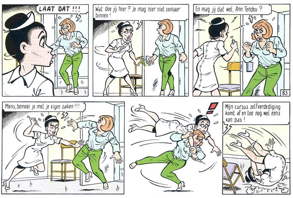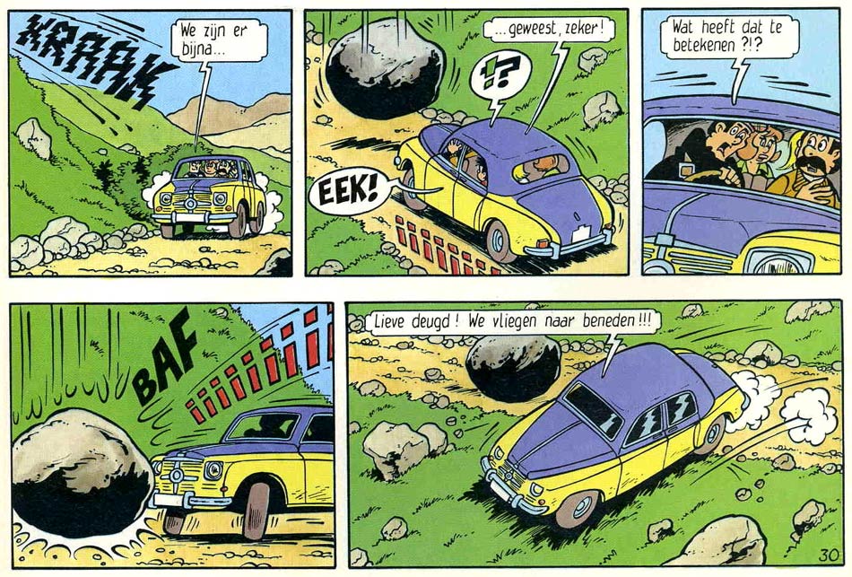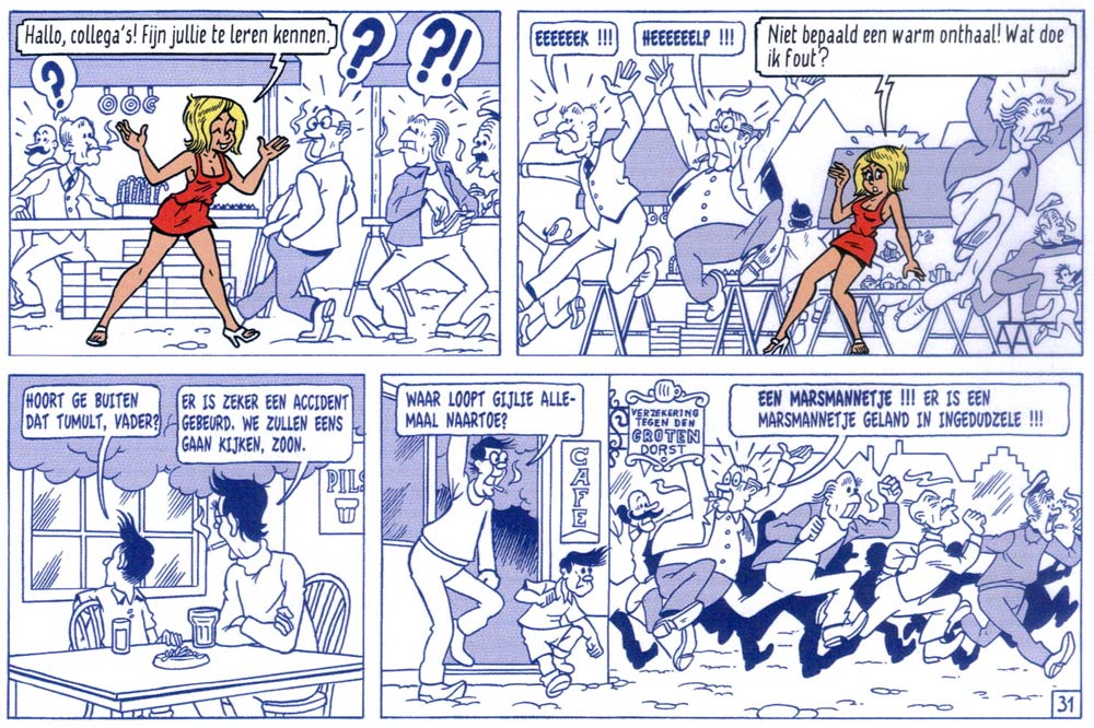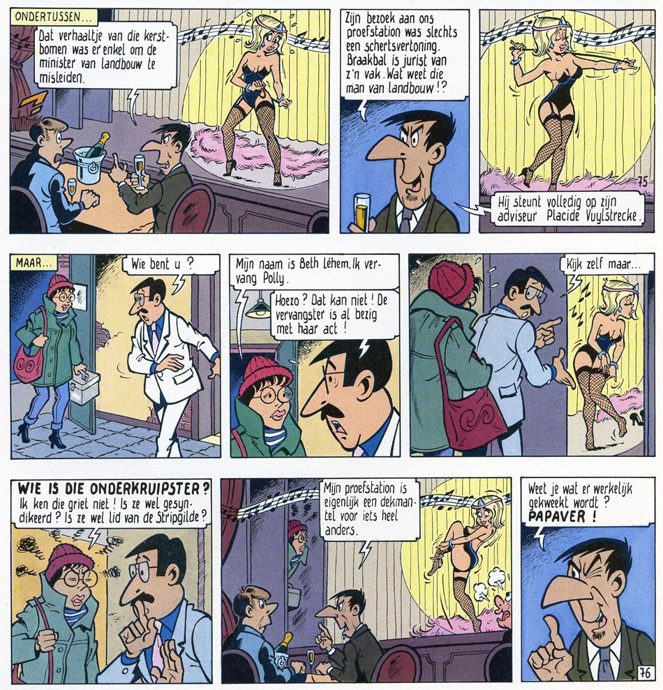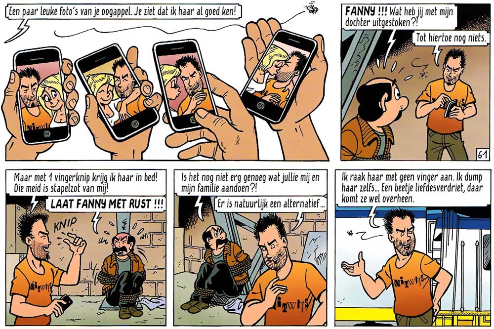Merho was quite amazed how certain topics became more socially acceptable (in comics) as time marched on. At the start of his career, he wasn't allowed to imply that Fanny slept with her boyfriends. Over the years, he frequently teased censors with jokes and scenes that showed nudity or referenced sex. By the time he introduced Tomboy the prostitute in the series, his editors had already given up trying to censor him, knowing he would simply do what he wanted, anyway. All these elements increased 'De Kiekeboes’ popularity with readers. Prepubescent teens enjoyed the naughty jokes and were thrilled by the sly eroticism. Adults liked the series because it was far more mature than the average Flemish family comic.