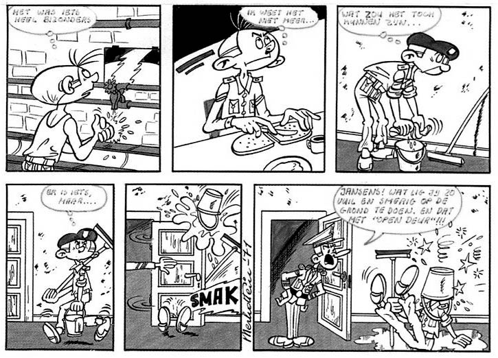 In 1970, Merho applied for a job as assistant at the Vandersteen Studios, at the time the most important and lucrative comic studio in Flanders. As luck would have it, one of their long-time collaborators, Eduard De Rop, had just quit earlier that afternoon. Merho was promptly hired and instructed to ink stories of the humorous superhero series 'Jerom', a spin-off of Vandersteen's signature series 'Suske en Wiske'. Two different versions of 'Jerom' were made at the time, one for the Dutch-language market, the other for German magazines. Merho worked on the German-language series. While he was honored to work for one of his childhood idols, he was drafted into military service after three months. He found a creative outlet through the gag comic 'Soldaat Jansens', published in the base paper. The title was later changed to 'Jager Jansens', since his character's uniform resembled the military rank 'jager' (part of the infantry) more than a common soldier. By volunteering to take care of the military library, Merho could stay away from pointless drills and find excuses to leave the base from time to time, "to buy necessary accessories". After being discharged, his 'Jager Janssens' comic was continued by another future comic talent: Hec Leemans.
