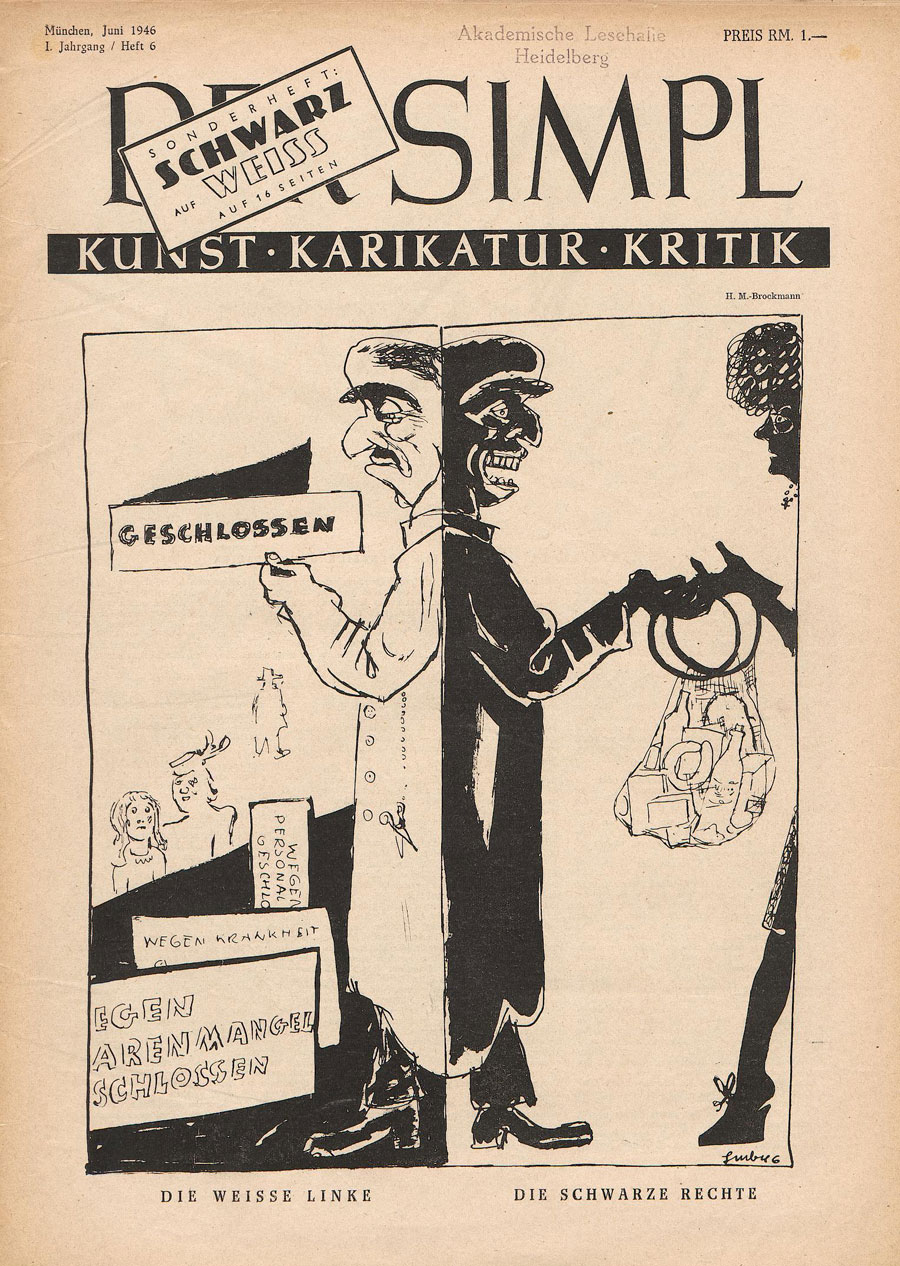 Cartoons on the covers of Der Simpl #6 (June 1946) and Simplicissimus #1, 1954 (9 October 1954).