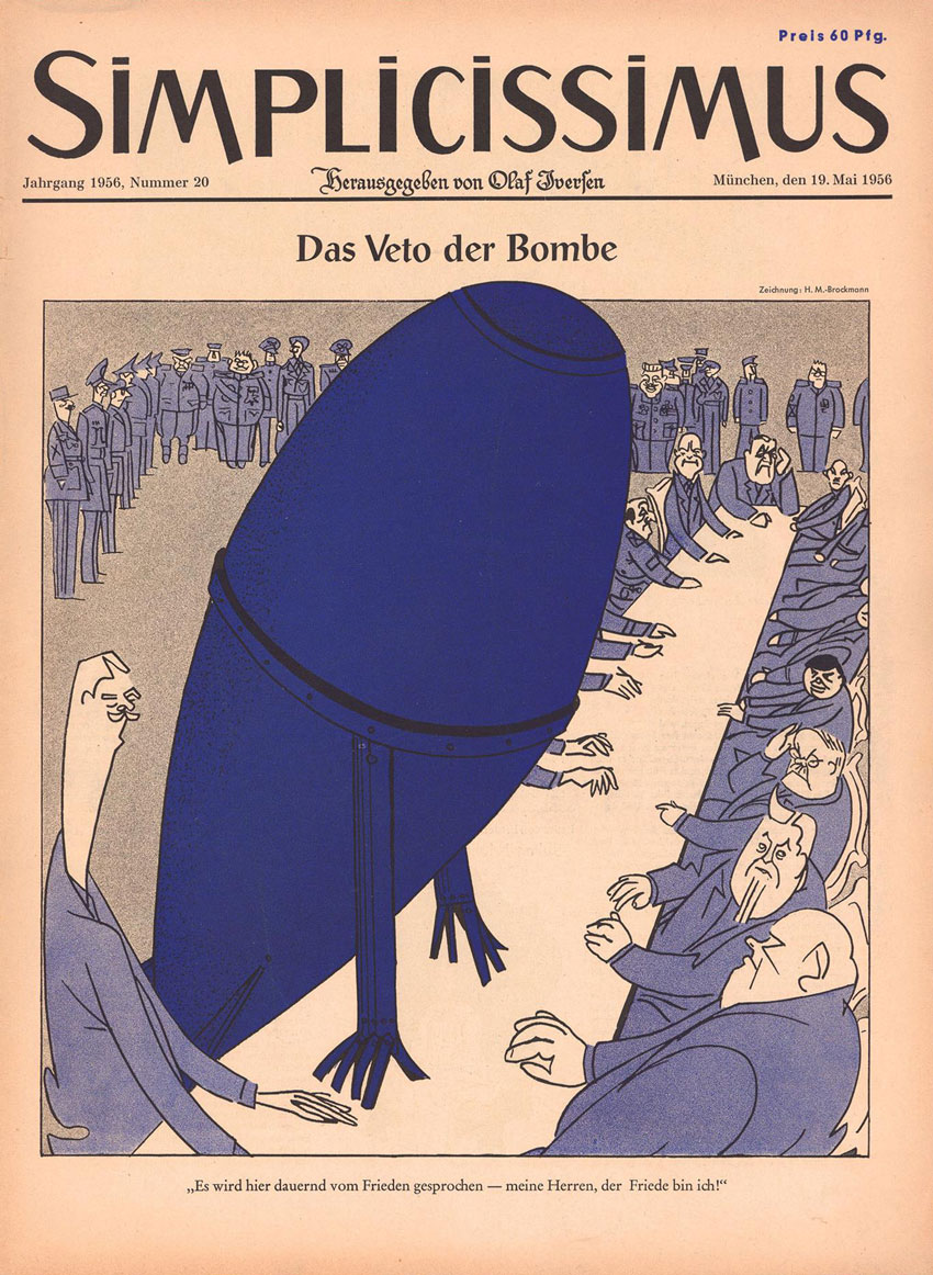 'Das Veto der Bombe', on the cover of Simplicissimus #20 of 1956. Translation: "There's a lot of talk about peace, dear gentlemen. But peace, that's me."