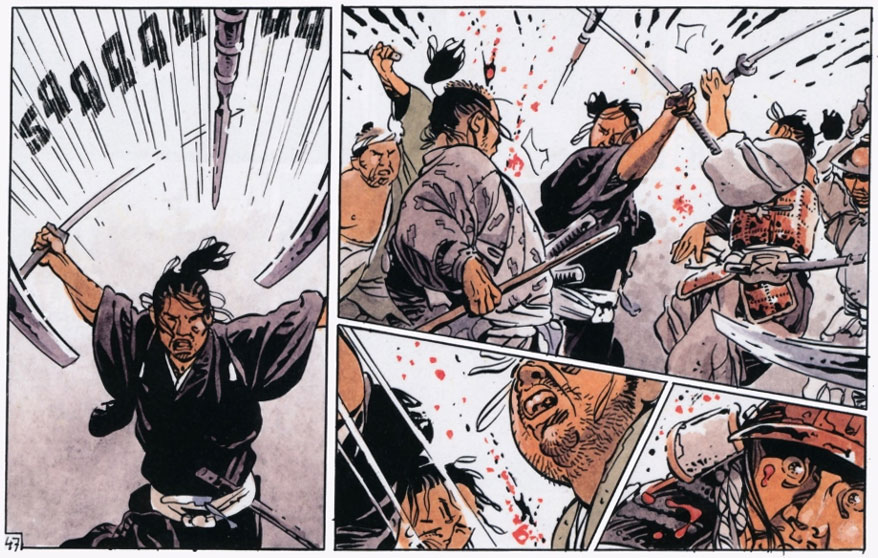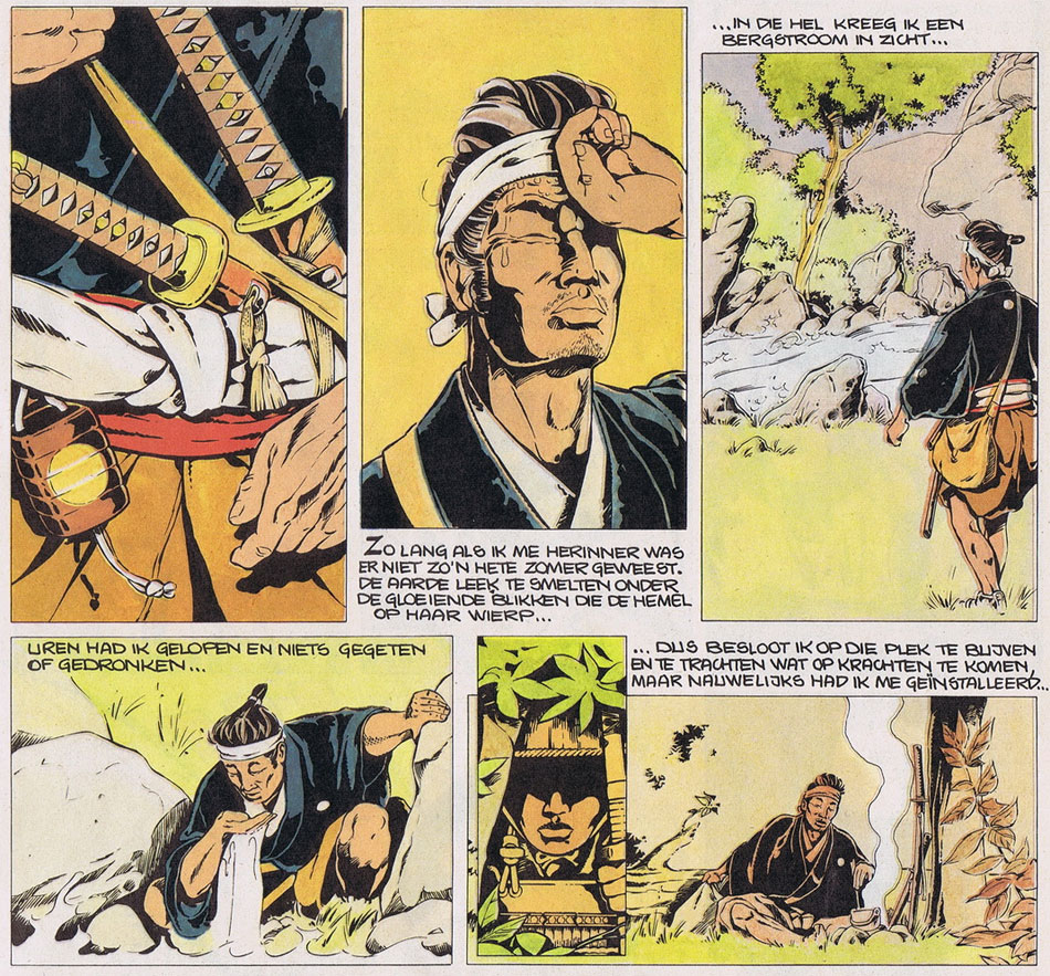 Along the way, the initially loyal and somewhat arrogant Kogaratsu loses faith in his master's methods and motives. Leaving Bando, he becomes a rōnin, a wandering samurai without a master. From then on, Kogaratsu travels through medieval Japan, helping those in need. While the early stories of the 'Kogaratsu' series were mainly event-driven, the later episodes had more room for reflection and character development. As the episodes progress, Kogaratsu becomes older and wiser, while his physical strength weakens. Strongly embracing influences from Japanese art and philosophy, Michetz and Bosse centered their later story about the spiritual journey of their hero. Characteristic in this development was the transformation of the artist's signature: in Japanese style, Michetz placed the letters vertically in Sōsho, the calligraphy in which the brush does not leave the paper while writing.