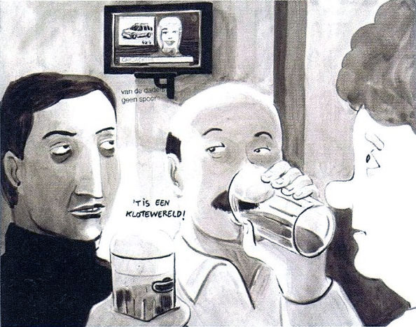 In 2010, Steve published his first graphic novel, 'Burgerlijke Schemering' ("Civil Twilight", De Harmonie, 2010). The title refers to the scientific term when daylight transcends into night time. A balding man with a black mustache, Albert, goes out for a drink when the evening falls. He passes by daft and horrifying events until he reaches his favorite tavern. While he is out, his wife organizes a tea party, which also takes a disturbing turn. The story is a metaphor for the twisted things that hide beneath a facade of normalcy, waiting to come out at night. 'Burgerlijke Schemering' features one illustration per page. This cinematic aspect allows for a slower reading tempo where the detailed images can absorb into the audience's mind. Again, little dialogue is used. Originally Steve envisioned his story as a traditional balloon comic, but he didn't like the end result. In the back of the final book, he added this early version as well as preliminary sketches, while explaining his motivations and working method. These extras were intended as a tongue-in-cheek "making of", comparable to extras on a DVD. Interviewed by Geert De Weyer for De Morgen (7 December 2010), Steve explained he was inspired by reality shows, which spend far more attention to "making and preparing" an excellent pop singer, cook or top model than the end result. The book was also translated into French as 'Crépuscule Civil'. The Belgian graphic artist Ever Meulen named 'Burgerlijke Schemering' one of the best books of the year.