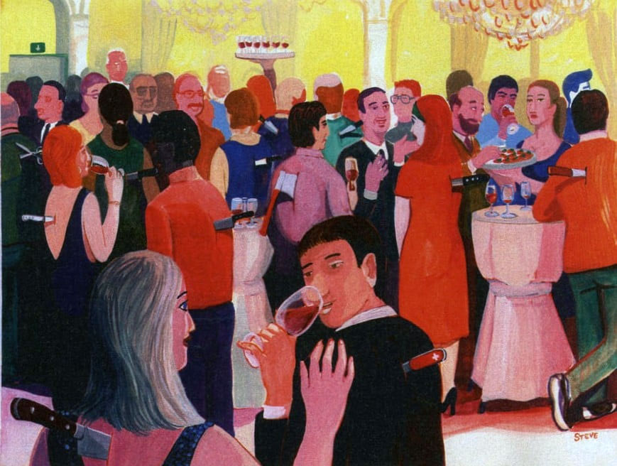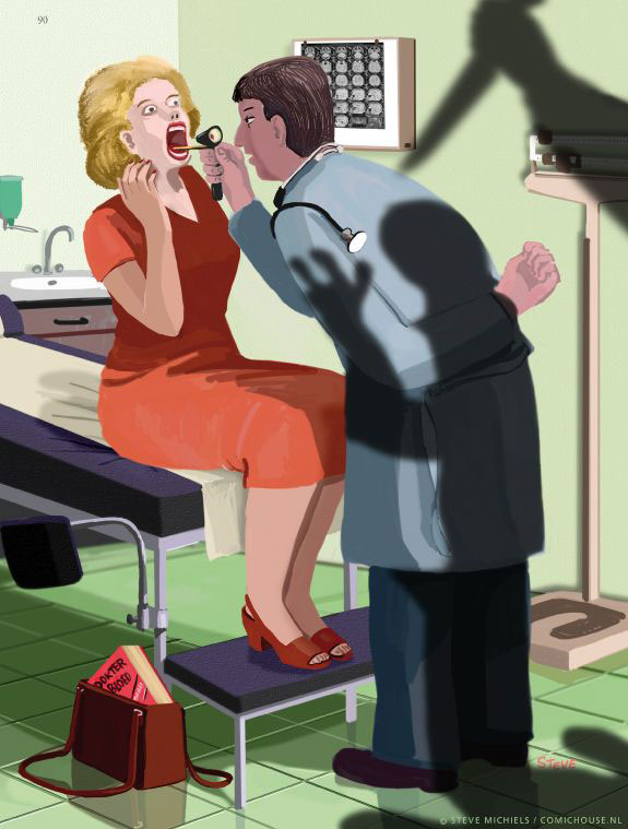 In 1993, thanks to Kamagurka's recommendation, Steve made his professional debut in newspaper De Morgen. He provided illustrations for the weekly 'Ter Zake' column in the Saturday supplement. As the column often dealt with economics, he considered it a challenge to liven up this dry topic. Throughout the decades, his cartoons appeared in Humo, Knack, AGENDA Magazine, Bruzz, TV-Expres, Teek, Bonanza, De Tijd, Het Laatste Nieuws and De Standaard. In the Netherlands, they were published in NRC Handelsblad, VPRO Gids, Het Parool and Vrij Nederland, while French audiences were introduced to his work in the pages of Fluide Glacial. Steve was also one of the earliest Flemish cartoonists to make his cartoons available online. He first posted them on the Internet in 1996, and then established his own website 'All About Steve' (a pun on the film 'All About Eve') in 1999. During his early career, Steve's main source of income was painting decorations for porcelain plates which city/town councils hand out to jubilees. Since 2004, Steve has taught Illustration and Graphics at the Sint-Lukas School of Arts in Ghent. Among his pupils were the cartoonists Brecht Evens and Brecht Vandenbroucke. Steve is a member of the collective and website The Cartoonist, hosted by Marec, where Belgian cartoonists make their archive and latest work available to the public.