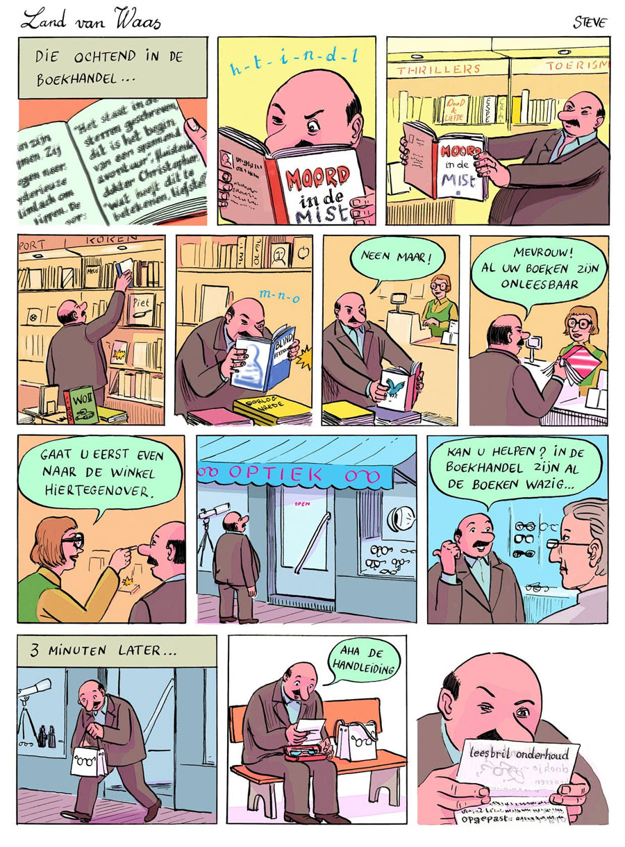 Steve wrote a contribution to 'Er Was Geenszins' (Oogachtend, 2007), a collection of absurd fairy tales aimed at an adult audience, written by various authors, all illustrated by Kim Duchateau. He contributed a comic strip about René Magritte to the collection 'Bruss. 2: Brussels In Shorts' (Oogachtend, 2014). In an interesting side note, Steve's own grandparents lived in the Prudent Bolslaan, only a few streets away from Magritte's home in the Esseghemstraat in Jette. Steve was one of many Belgian cartoonists to make special cartoons and comics for Gilles Dal's book 'België, et cetera' (Van Halewyck, 2016), a funny look at the history of Belgium. The same year he was interviewed by Roel Daenen for his book 'Het Is Maar Om Te Lachen: Hoe Cartoonisten De Wereld Veranderen' (Polis, 2016), which collects interviews with Belgian cartoonists regarding censorship, in the light of the 2015 terrorist attacks at the headquarters of the French satirical magazine Charlie-Hebdo. Steve was additionally one of several artists to pay graphic tribute to Ever Meulen during the 'Ever Meulen & Friends' exhibition in Brussels (October 2017).
