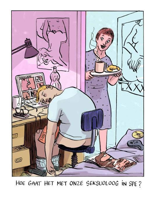 Cartoon by Steve. Translation: "How's our prospective sexologist?"