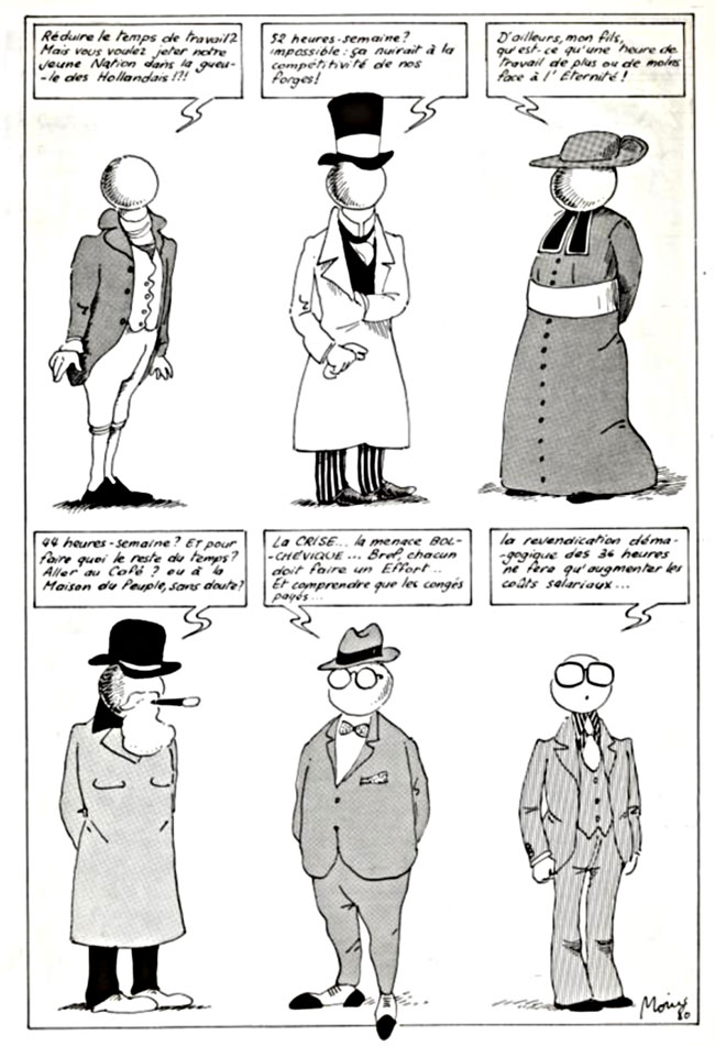 Comic strip for '150 B', about the anniversary of Belgium in 1980. It depicts how throughout the country's history politicians, religious leaders and businesspeople have always resisted giving common workers benefits, like a shorter working week.