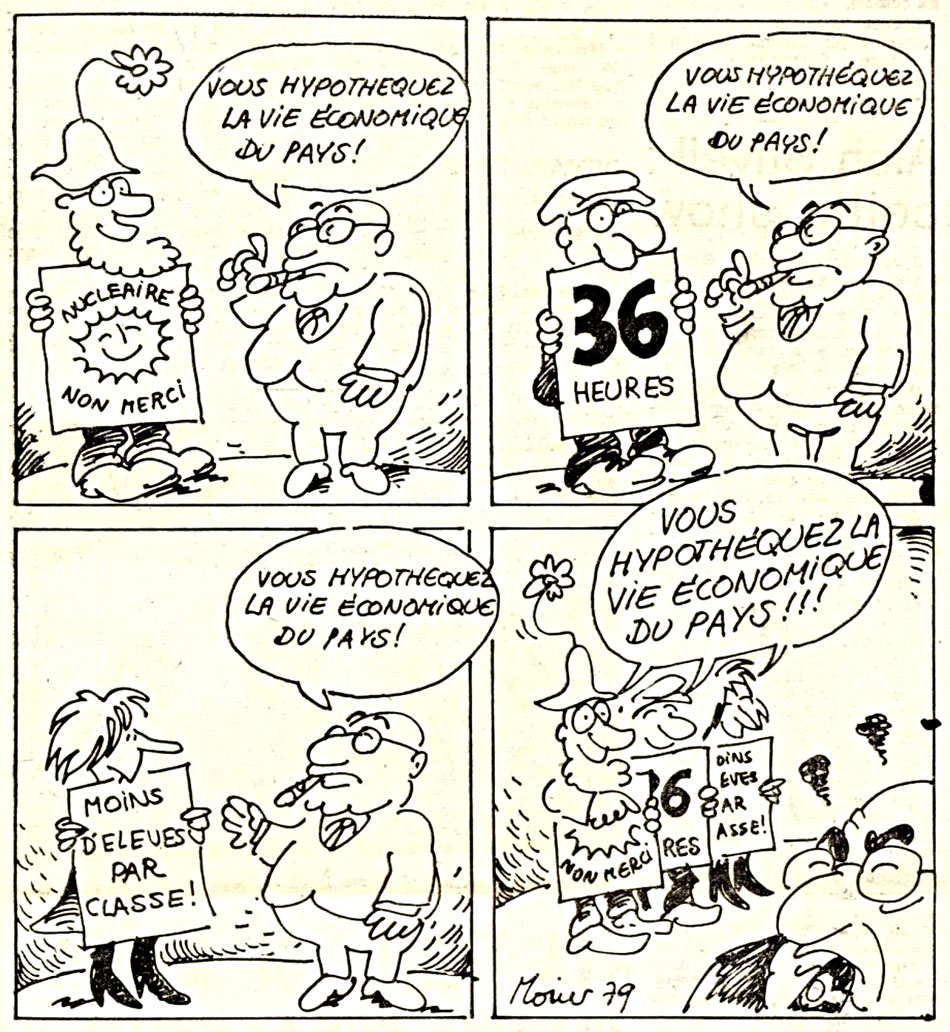 Comic strip for Le Drapeau Rouge, 11 April 1979. A businessman tells protesters that they are "mortgaging the economic life of the country", while they confront him with the same complaint.