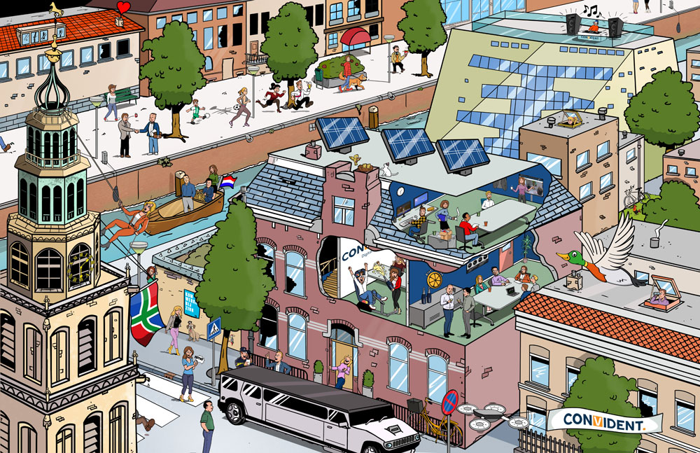 Through fellow cartoonist Frans Le Roux, he landed on assignments drawing detailed jigsaw puzzles for GasTerra and local firms from Groningen, such as the Chris Russell printing company and Convident digital marketing. Since February 2024, he has been working more closely together with Le Roux, for instance collaborating on a large (6 x 2,5 meter) wall illustration for the campus of the AFAS-Academy in Leusden.