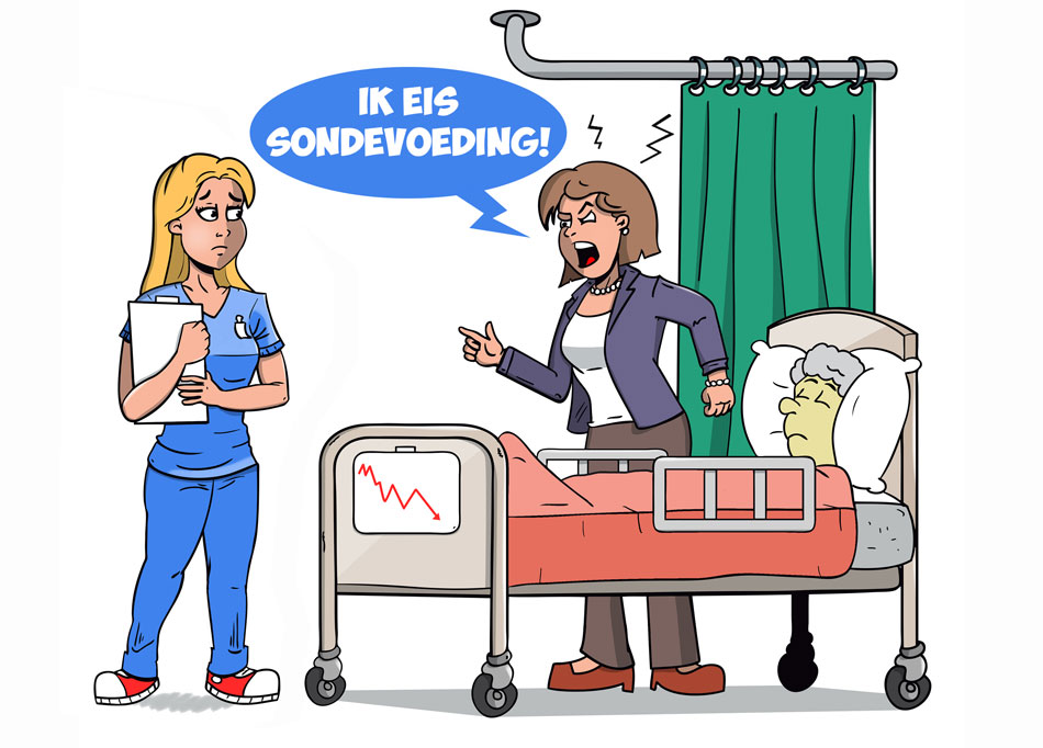 Comic strip for Haren de Krant, February 2021. Translation: "During the crisis, Zonnehof wants to brings youngsters and the eldery in contact." Old woman: "Not the contact I was hoping for."