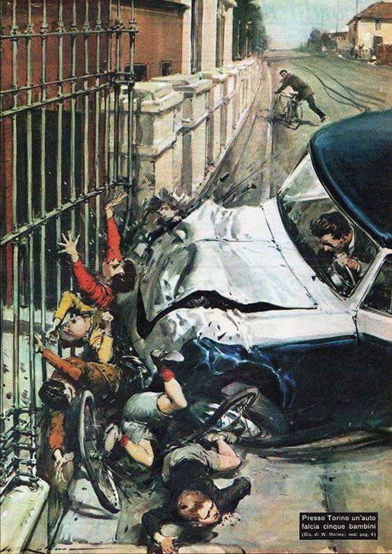 In 1941, Molino succeeded Achille Beltrame as the cover painter of the Domenica del Corriere, the Sunday magazine of the Milanese newspaper Corriere della Sera. Since its launch in 1899, the Dominica reported about the everyday joys and tragedies of the Italian population. The sensational covers reflected that mission, although emphasized on the tragedies. Molino served as the magazine's cover illustrator for 25 years. With their illustrative graphic style, Molino's paintings can be compared to the cover illustrations by Norman Rockwell for the Saturday Evening Post. But where Rockwell gave picture perfect portrayals of an idealized American society, Molino did the exact opposite. Based on actual news events, his depictions of everyday life take place right before things go awfully wrong. People falling from windows, gruesome traffic accidents, prams on the loose... Molino presented them with such an elaborate flair, that one has to look twice before the horror truly sinks in. For both the Domineca's cover and interior pages, Molino also made politically oriented illustrations. Other drawings were of dystopian futures with advanced technology. In 2020, Molino's drawing for a December 1962 article gained online attention. The crowded street filled with one-seater vehicles seemed almost prophetic of that year's social distancing measurements due to the COVID-19 pandemic.