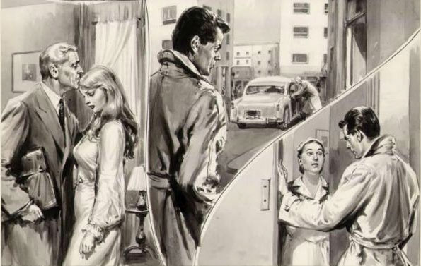The veteran illustrator devoted his final years to painting, exhibiting his work throughout Europe. One of his best-known paintings was the wax engraving 'Pulcinella, Arlecchino e Colombella' (1986). In 1995, the Milanese gallery Agrifoglio organized a career overview exposition under the title 'Walter Molino Tra Cronaca e Arte'. Graziano Origa compiled the accompanying catalog. Two years later, Walter Molino died in Milan, at the age of 82.