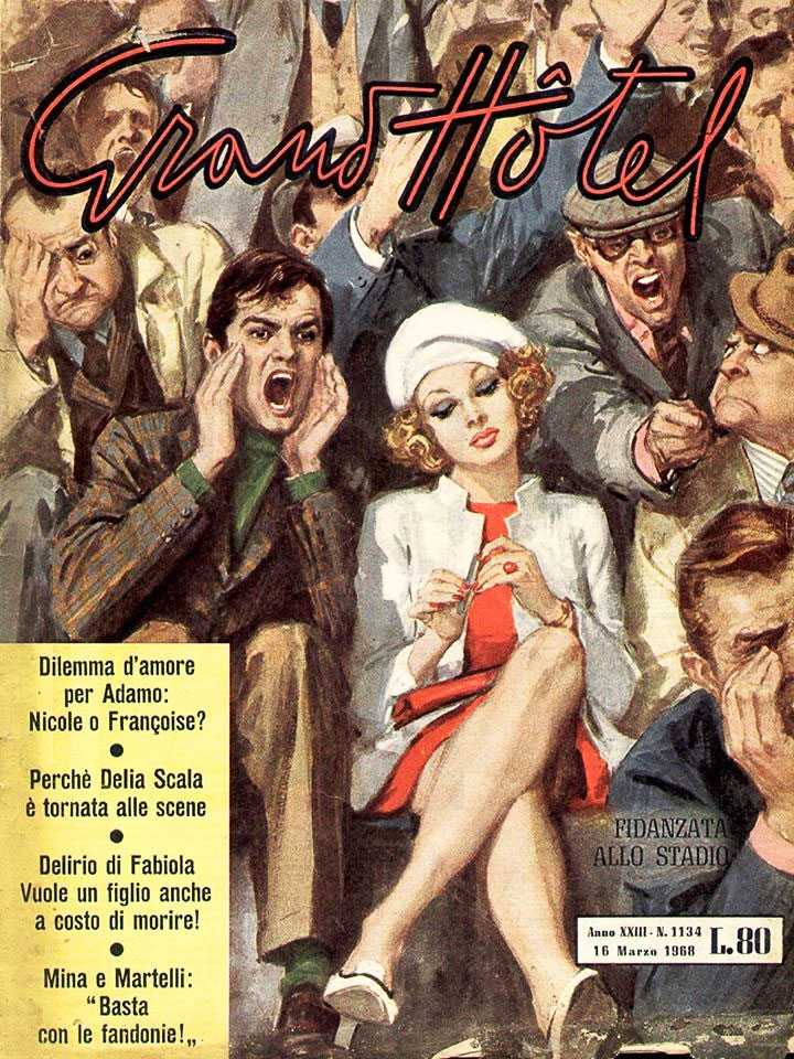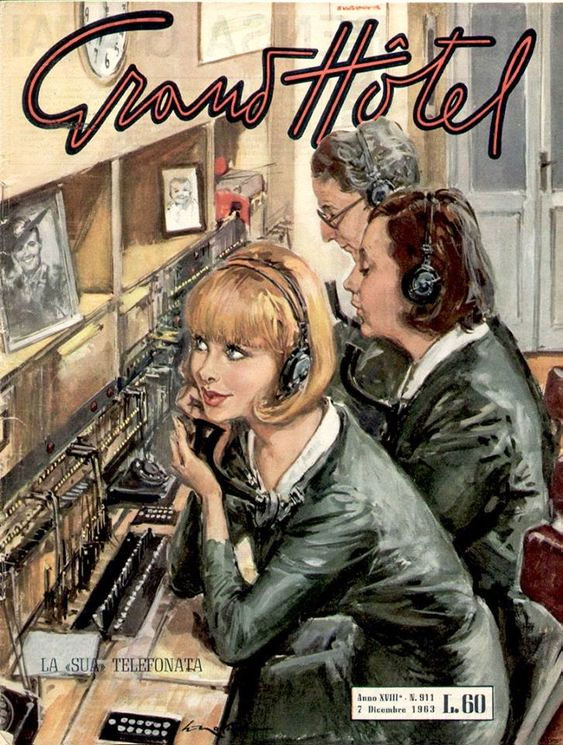 After the war, Molino renewed his collaboration with the Del Duca brothers, who were about to launch their women's weekly Grand Hotel (1946). Using the pseudonyms J. W. Symes and Sten, Molino was among the main illustrators until 1985, along with Giulio Bertoletti and Alvaro Mairani. Molino designed the stylish header, and contributed many romantic half-tone covers, as well as melodramatic picture stories ("cineromanzi") in ink wash, starring popular stars from the big screen. Famous cover drawings by Walter Molino dealt with the birth of television (1954), the death of cycling champion Fausto Coppi (1960) and the Russians in space (1965). At first heavily condemned by the Catholic church for its morally corrupt content, Grand Hotel remains to this day one of the most popular news magazines in Italy. In France, Molino's art appeared in Nous Deux, Grand Hotel's sister magazine, also published by Del Duca. Starting in 1956, Molino's lavishly painted black-and-white strips were reprinted in the British magazine Titbits as well.